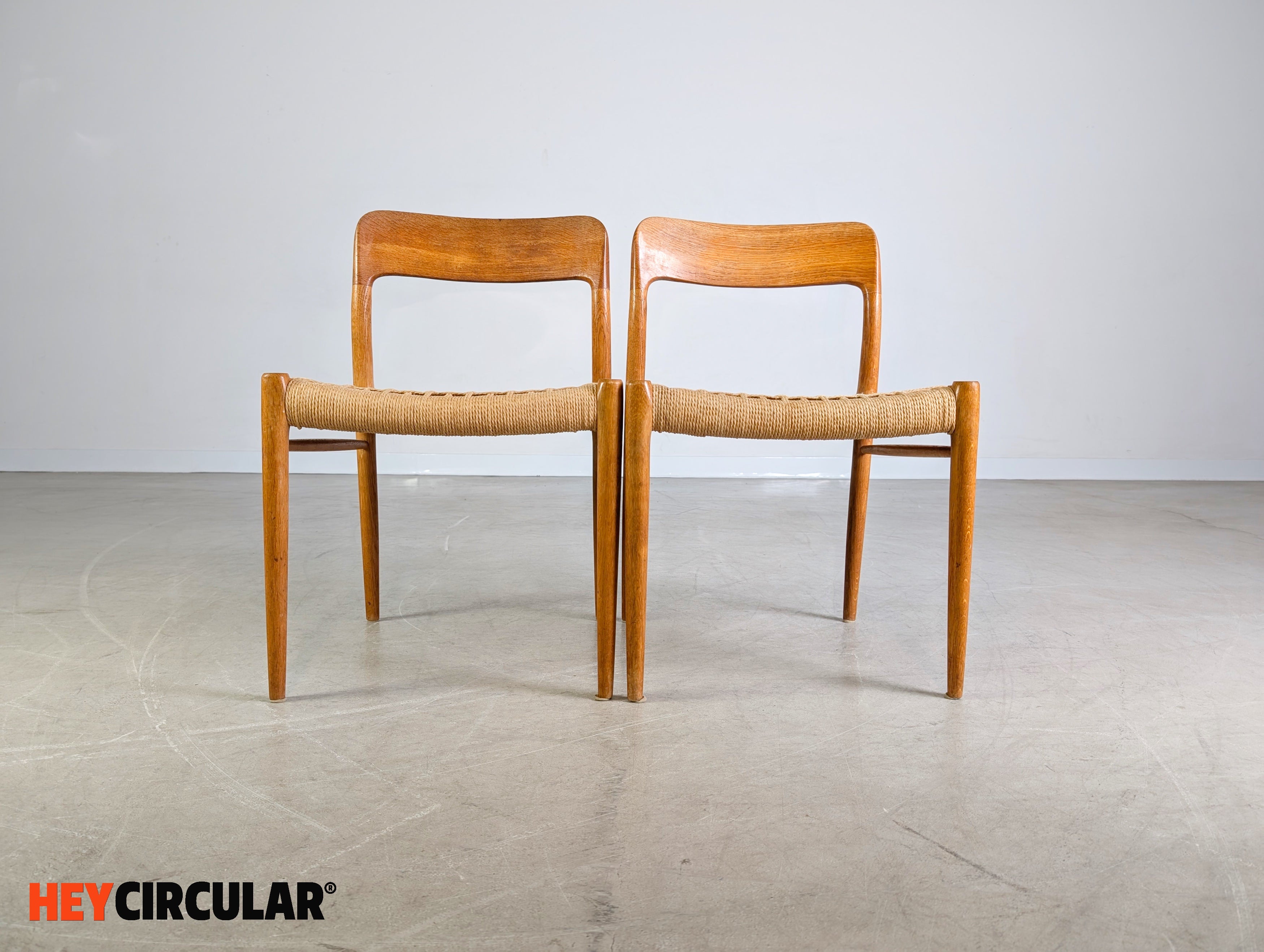 Wir bieten zwei wunderschöne Teakholz-Stühle von Niels O. Møller "Modell 77" zum Verkauf an. Die Stühle verfügen über die begehrte Ausführung mit Papierkordel.