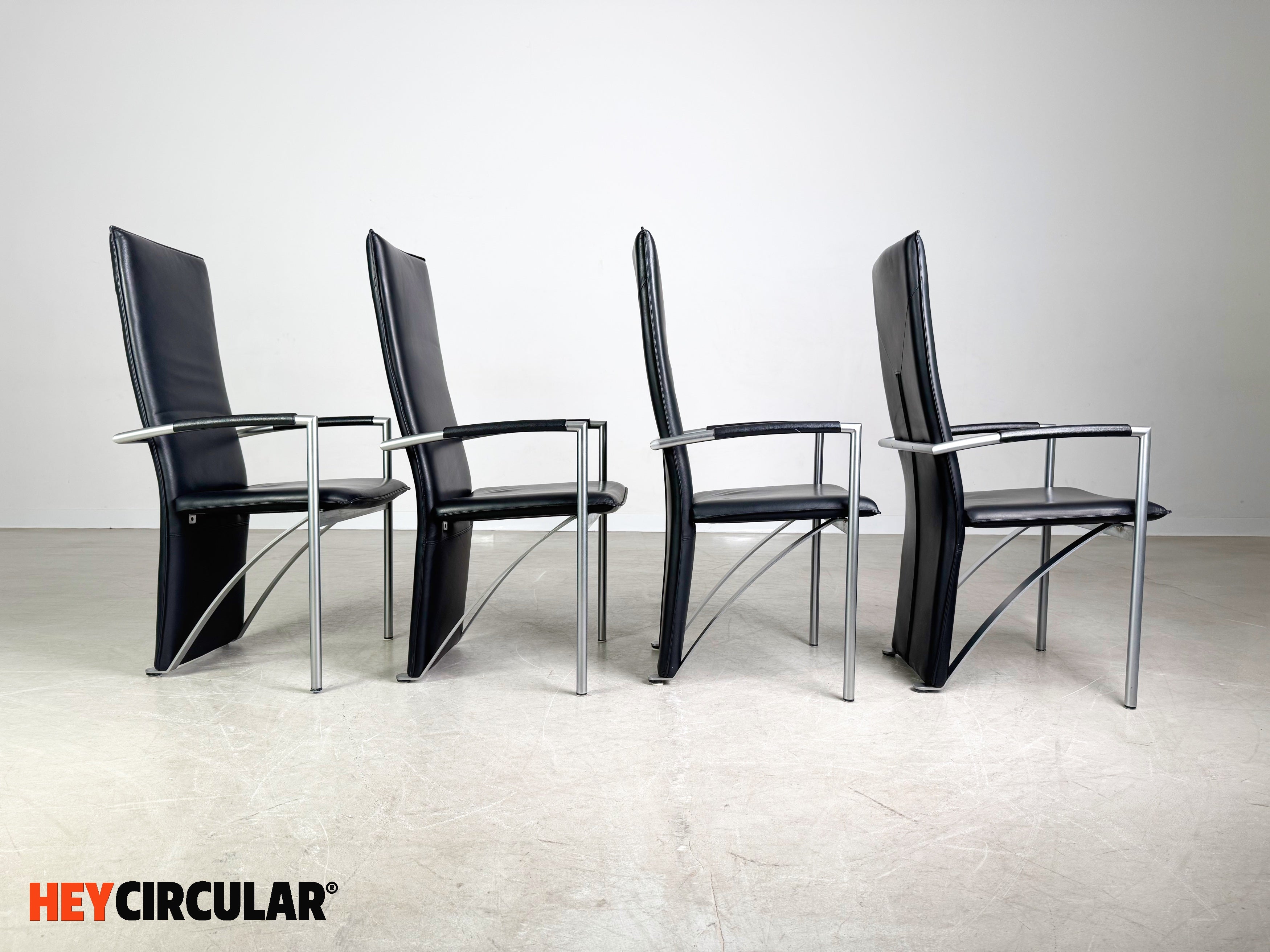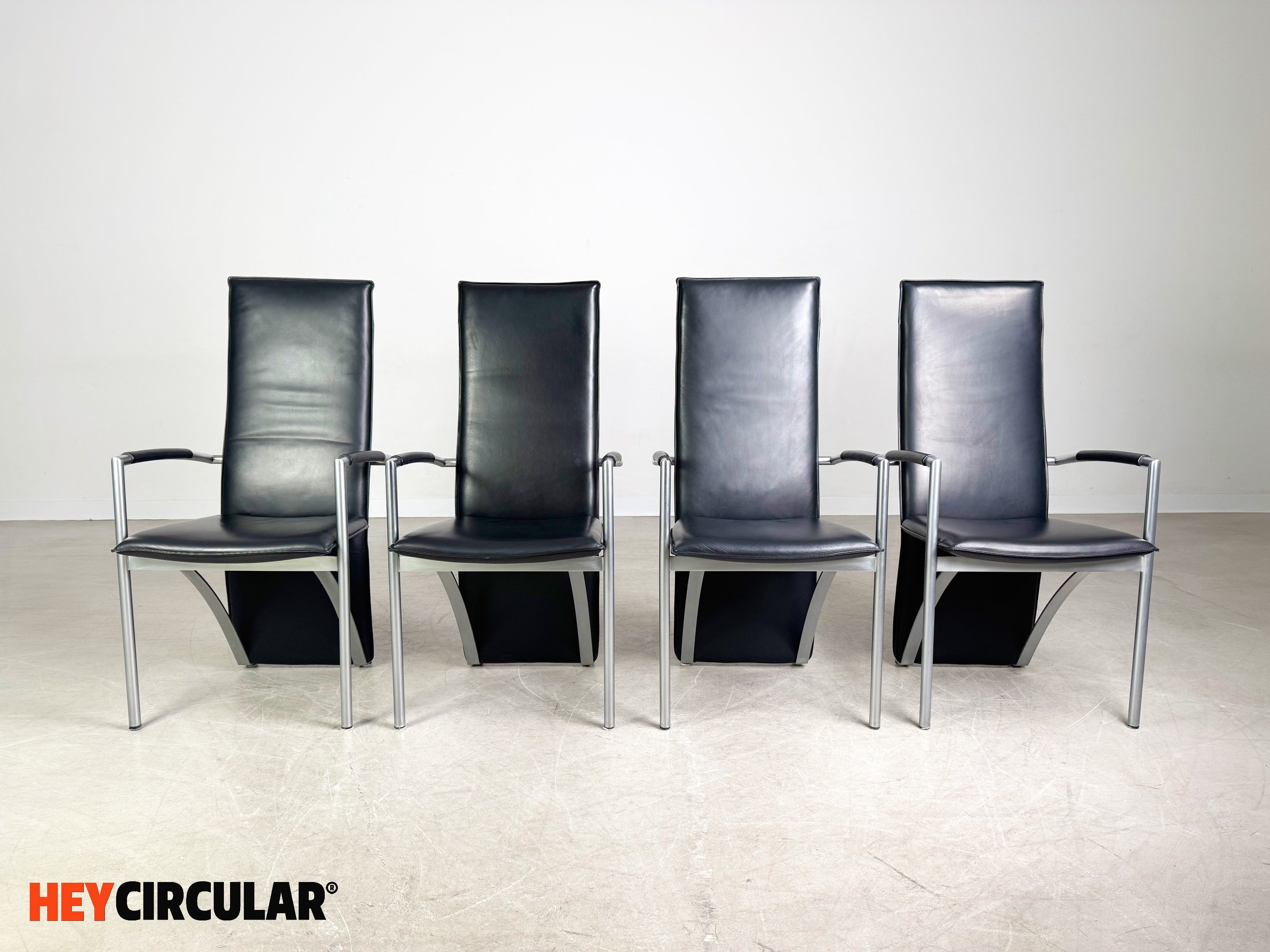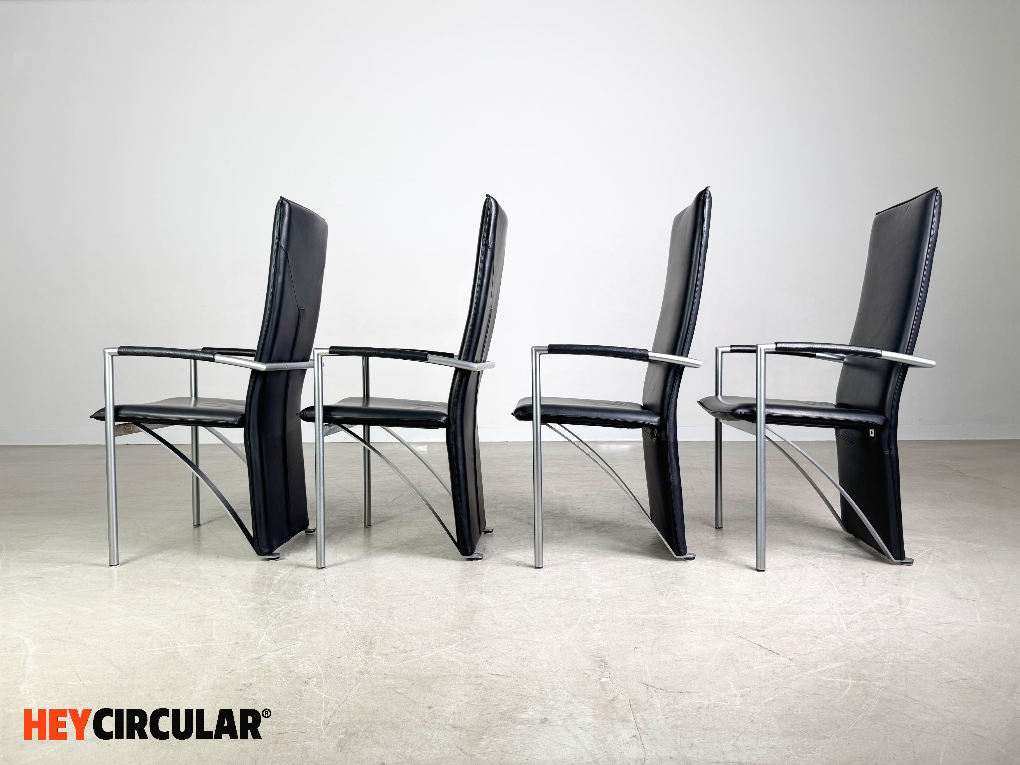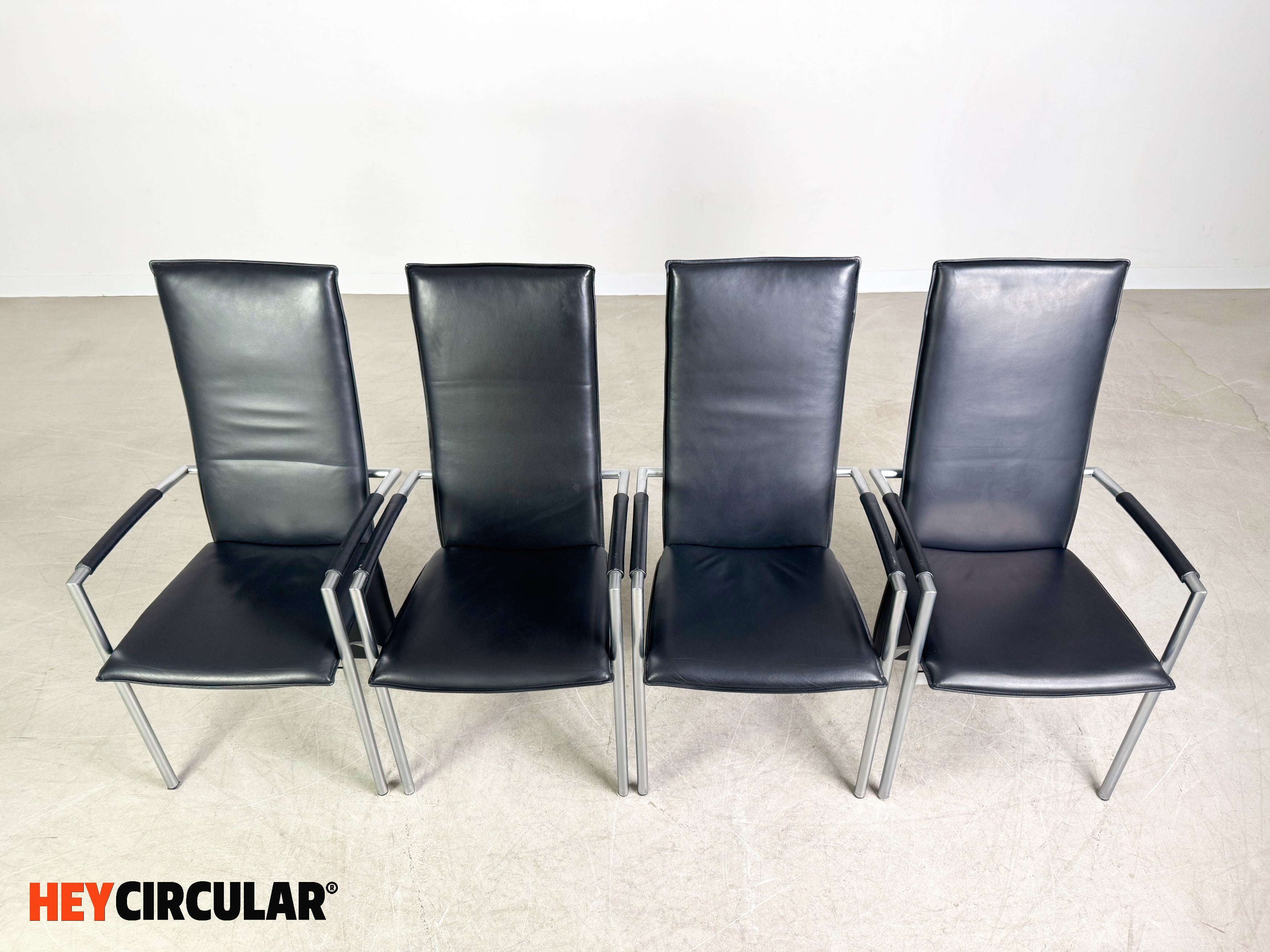 Wir bieten ein wunderschönes 4er Set RST4 Stühle von Ronald Schmitt zum Verkauf an. Die in Deutschland (Heidelberg) gefertigten Stühle verfügen über einen hochwertigen, schwarzen Lederbezug und bestechen durch ihre langlebige Qualität.