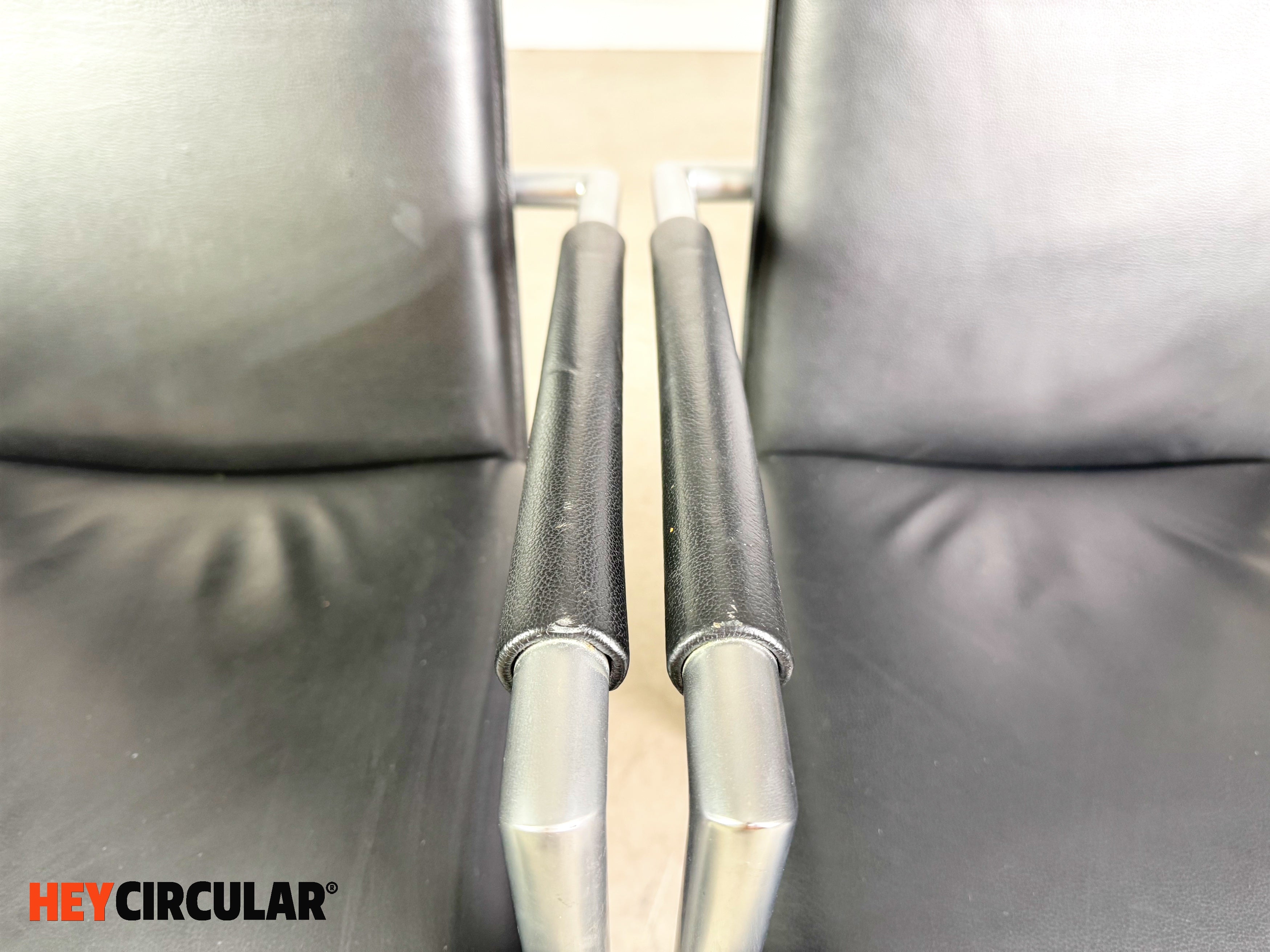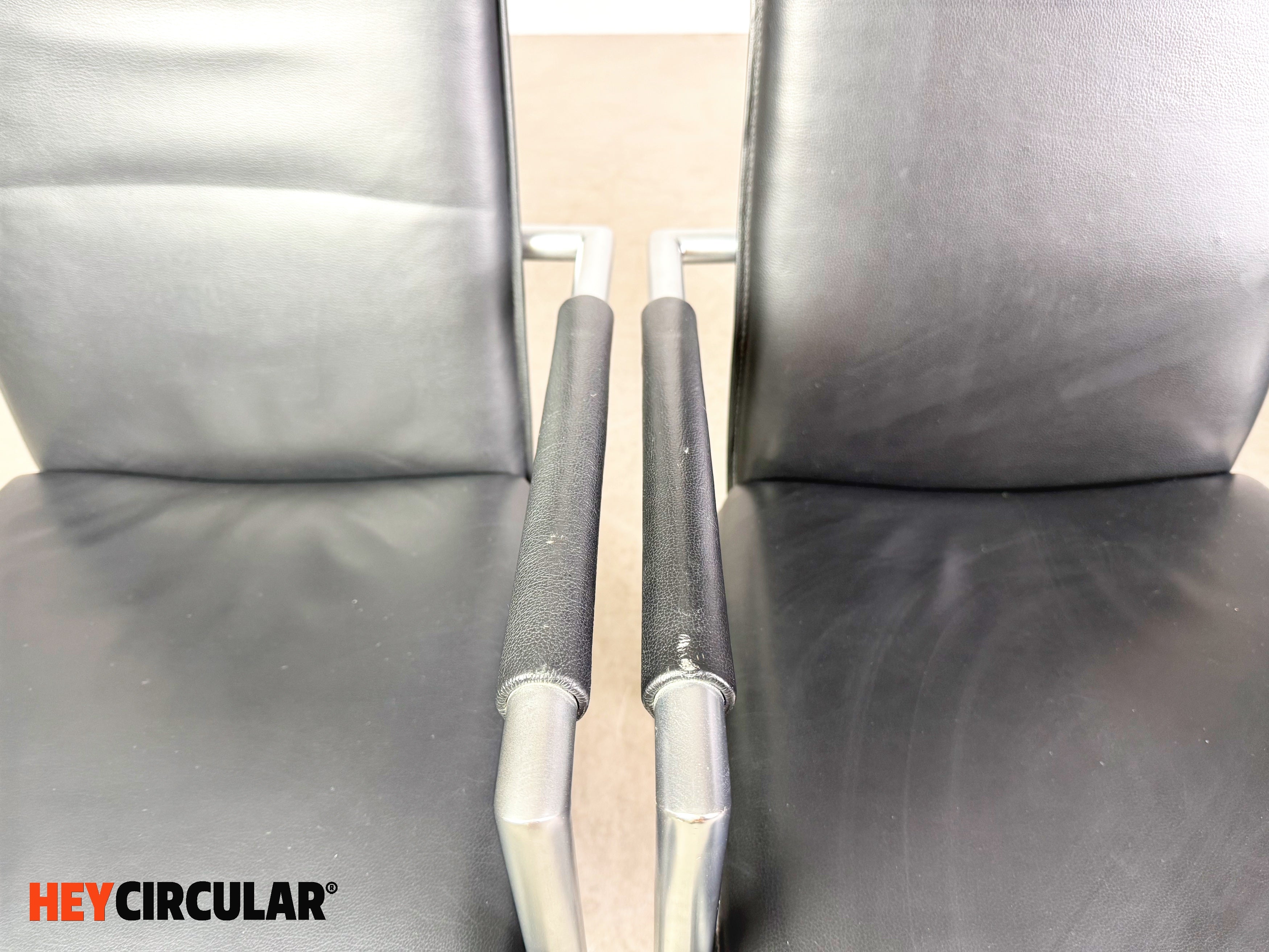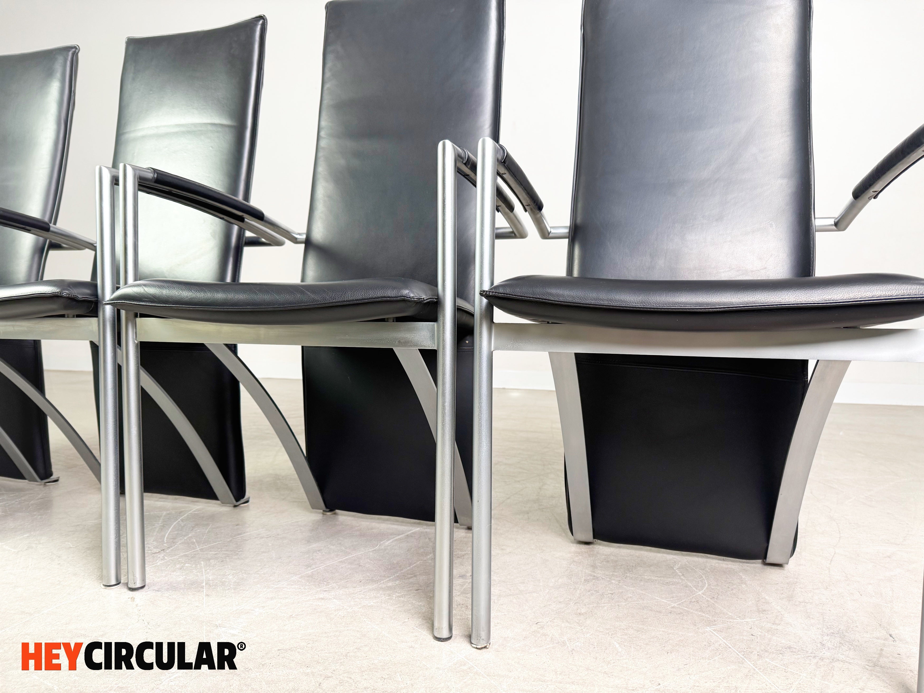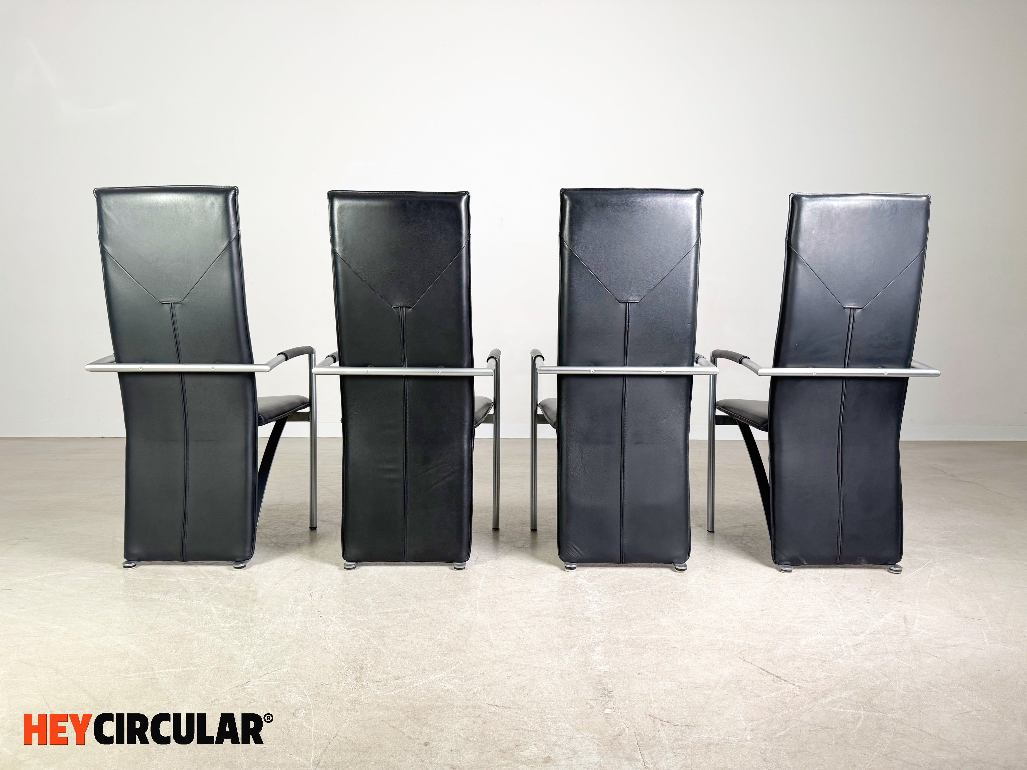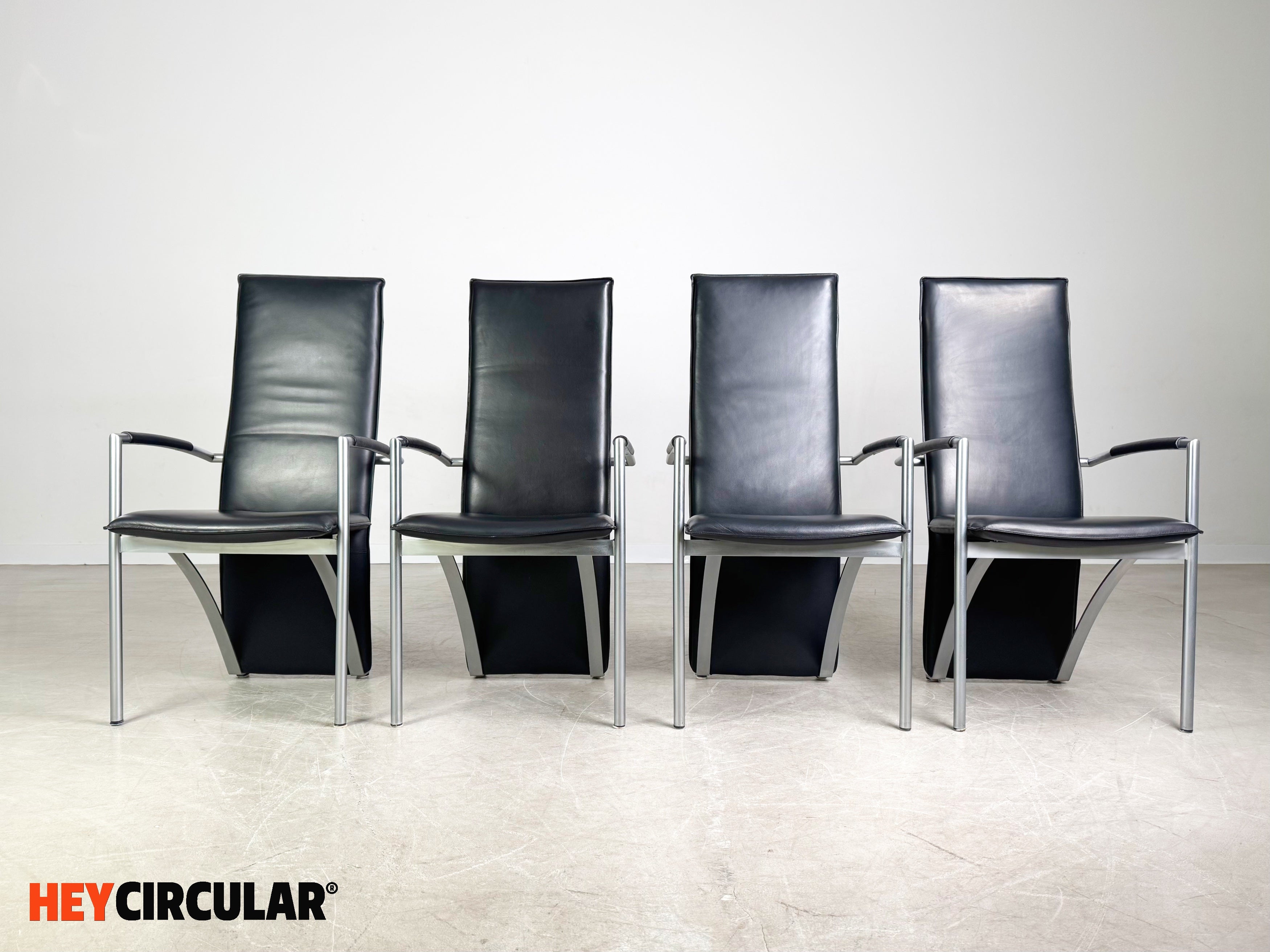Wir bieten ein wunderschönes 4er Set RST4 Stühle von Ronald Schmitt zum Verkauf an. Die in Deutschland (Heidelberg) gefertigten Stühle verfügen über einen hochwertigen, schwarzen Lederbezug und bestechen durch ihre langlebige Qualität.