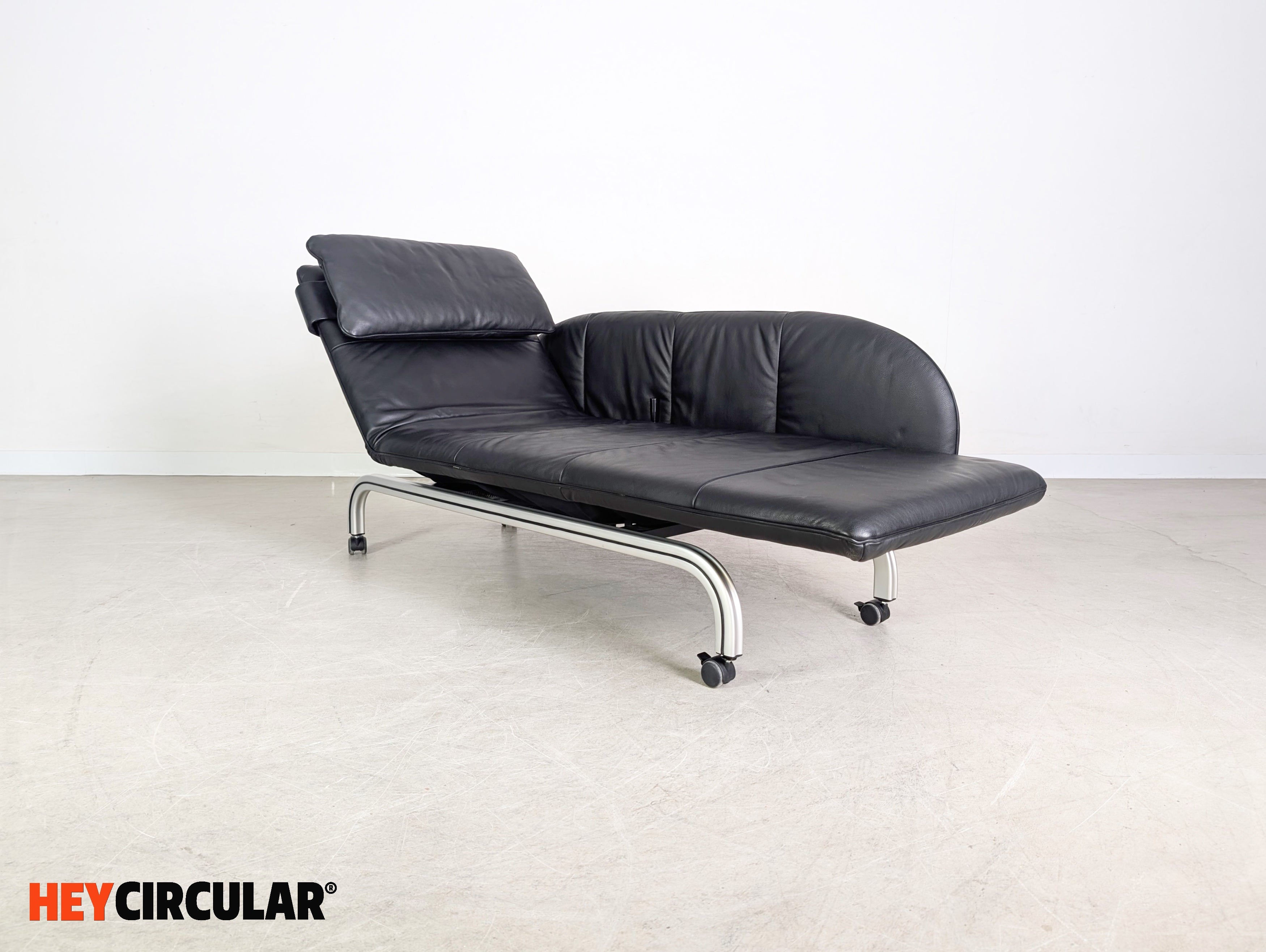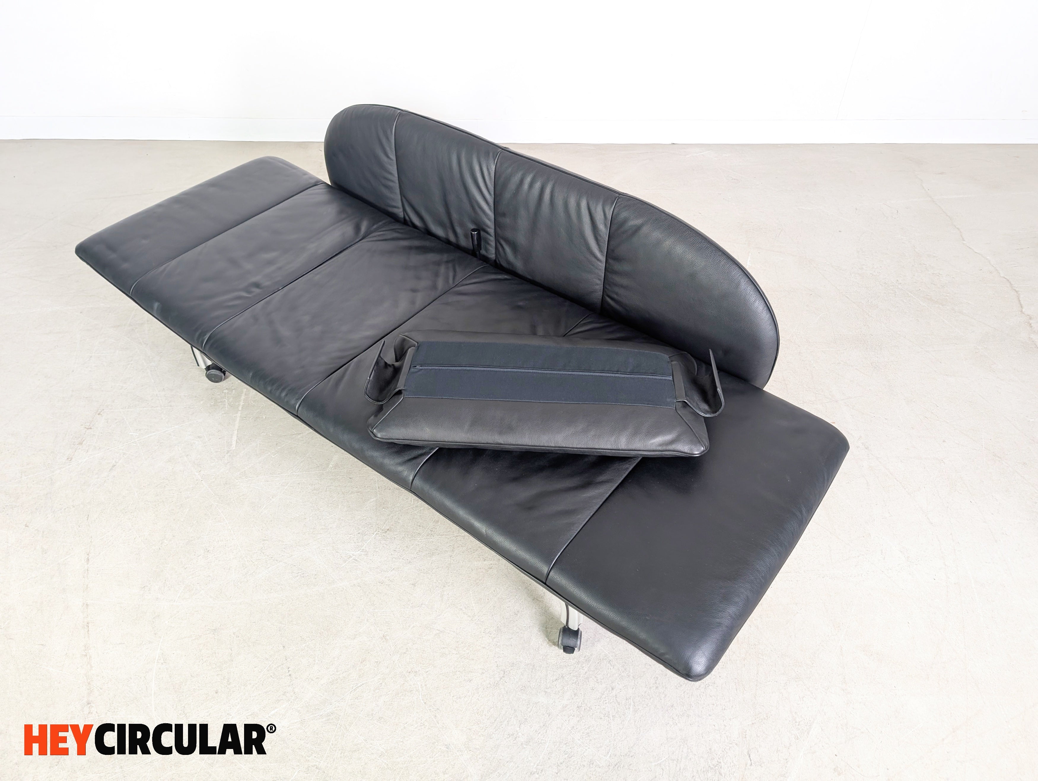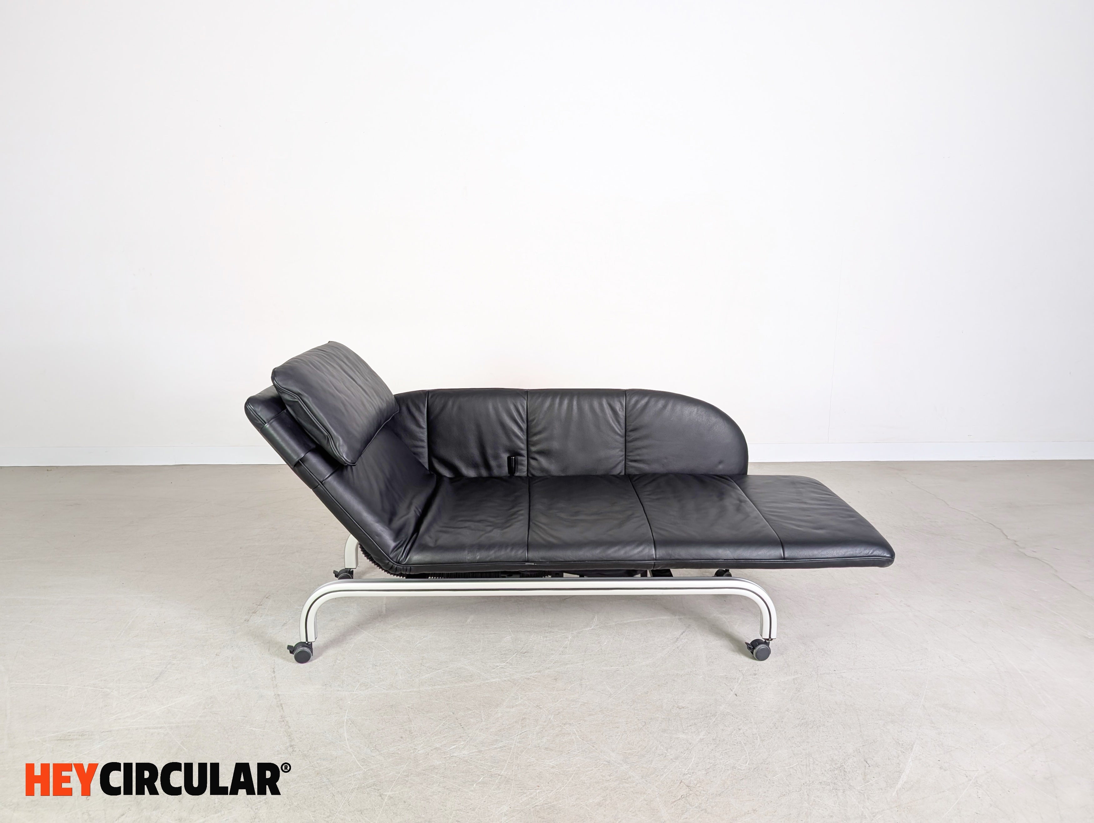 Wir bieten eine wunderschöne verstellbare Liege aus schwarzem Leder vom deutschen Qualitätshersteller Interprofil aus Bielefeld zum Verkauf an. Das Möbel lässt sich dank seiner zwei Rollen schnell und flexibel bewegen und ebenfalls optimal als Zweisitzer Sofa einsetzen.