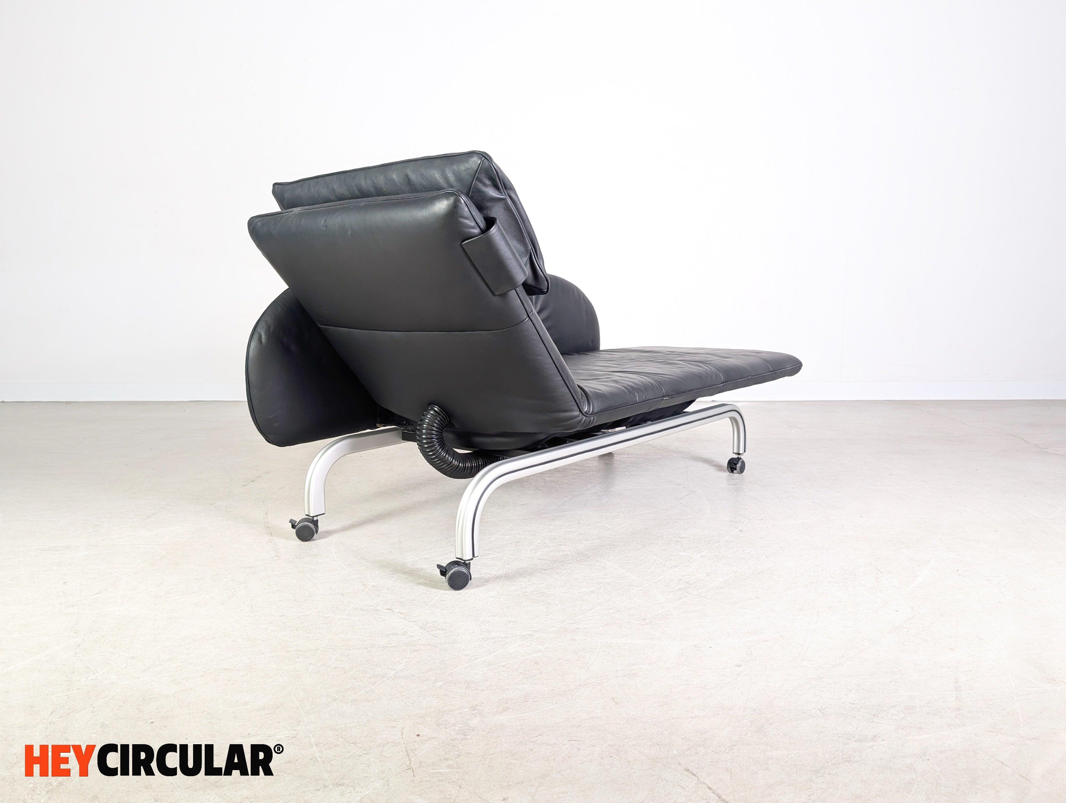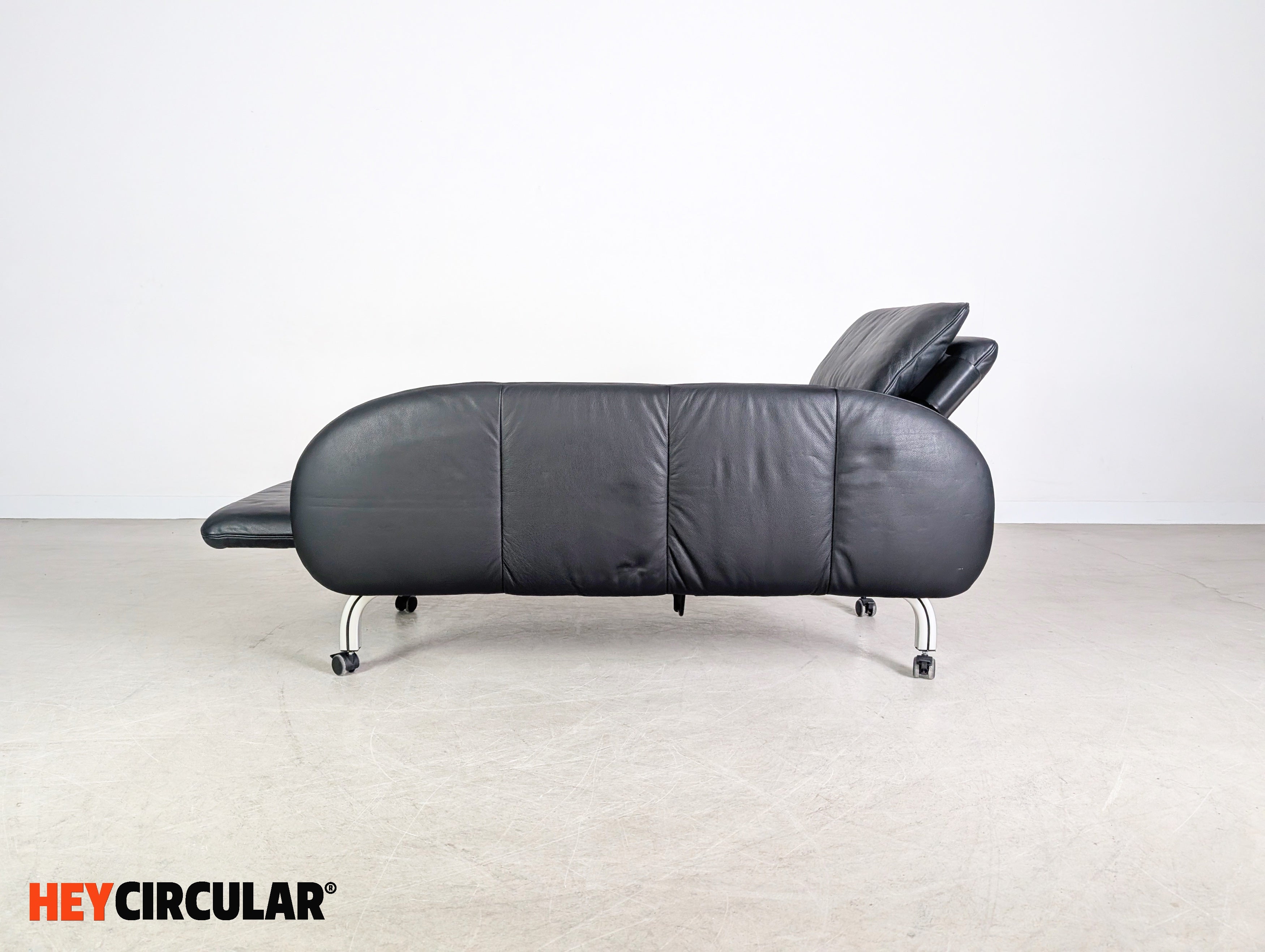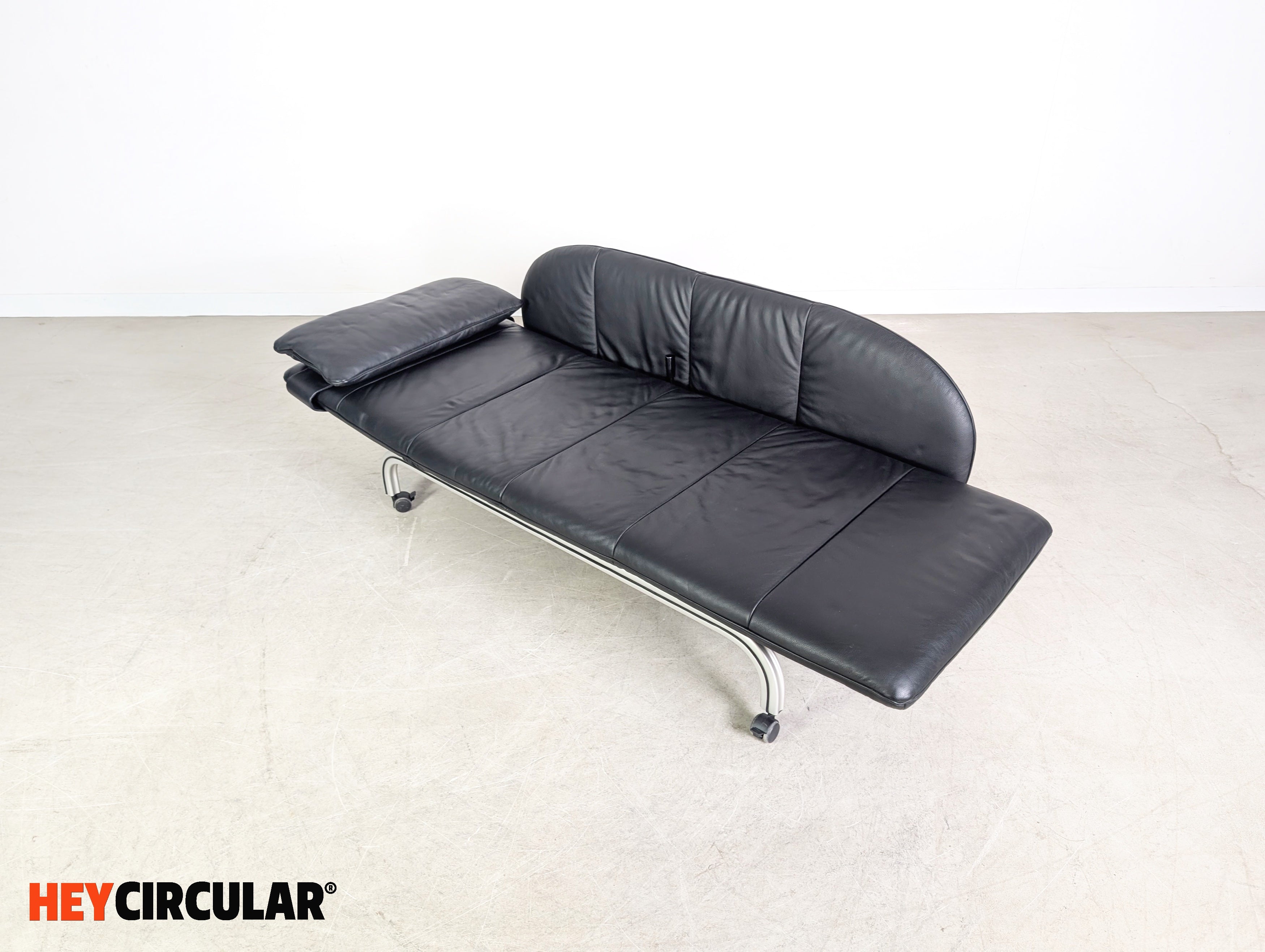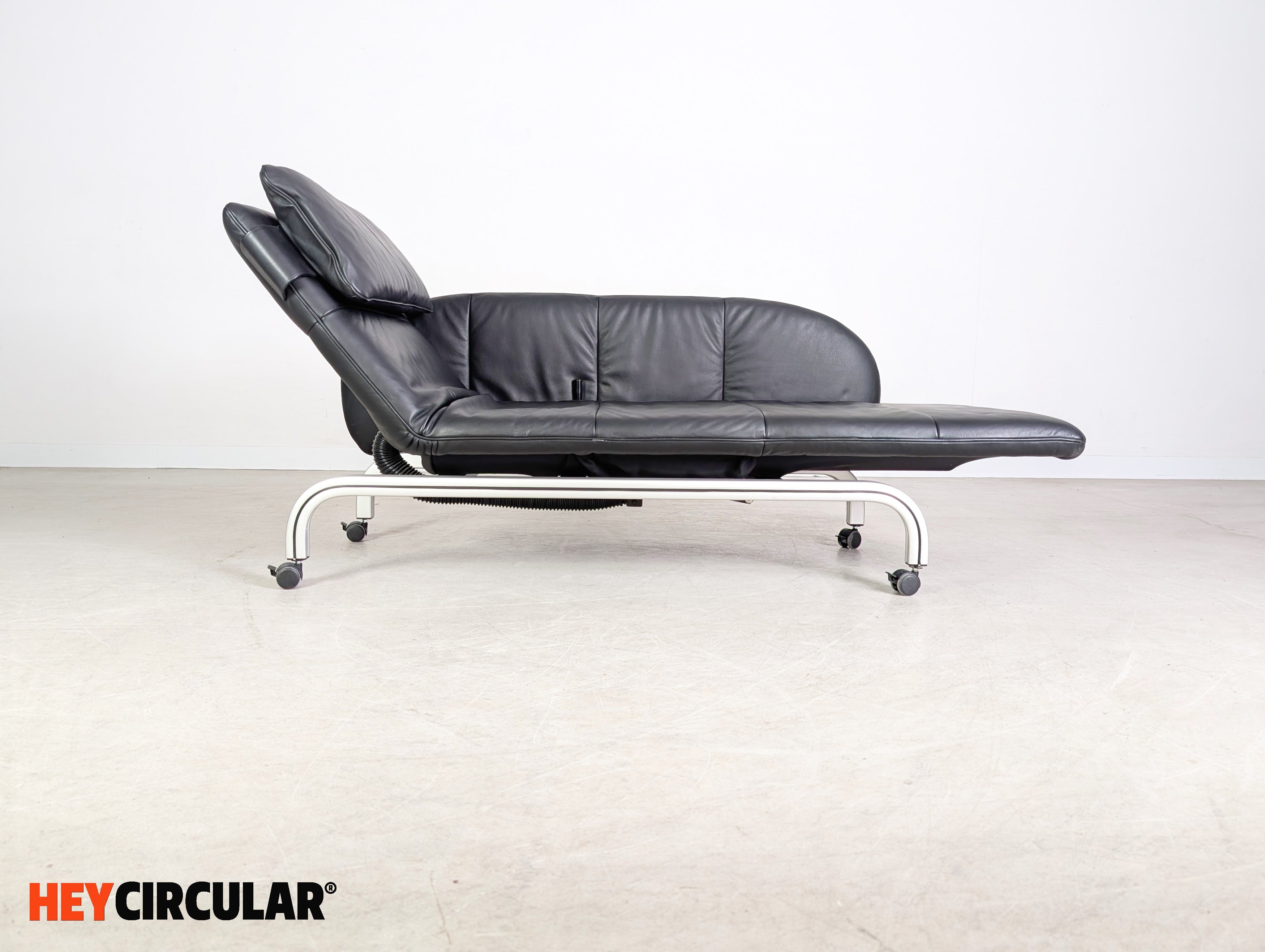 Wir bieten eine wunderschöne verstellbare Liege aus schwarzem Leder vom deutschen Qualitätshersteller Interprofil aus Bielefeld zum Verkauf an. Das Möbel lässt sich dank seiner zwei Rollen schnell und flexibel bewegen und ebenfalls optimal als Zweisitzer Sofa einsetzen.