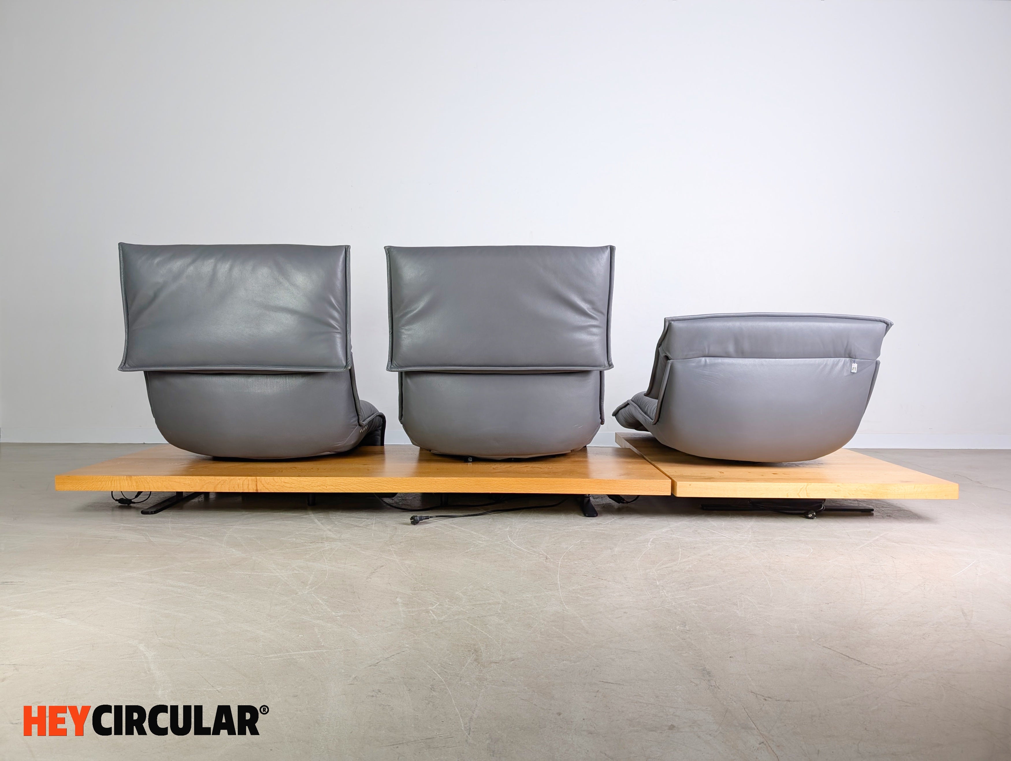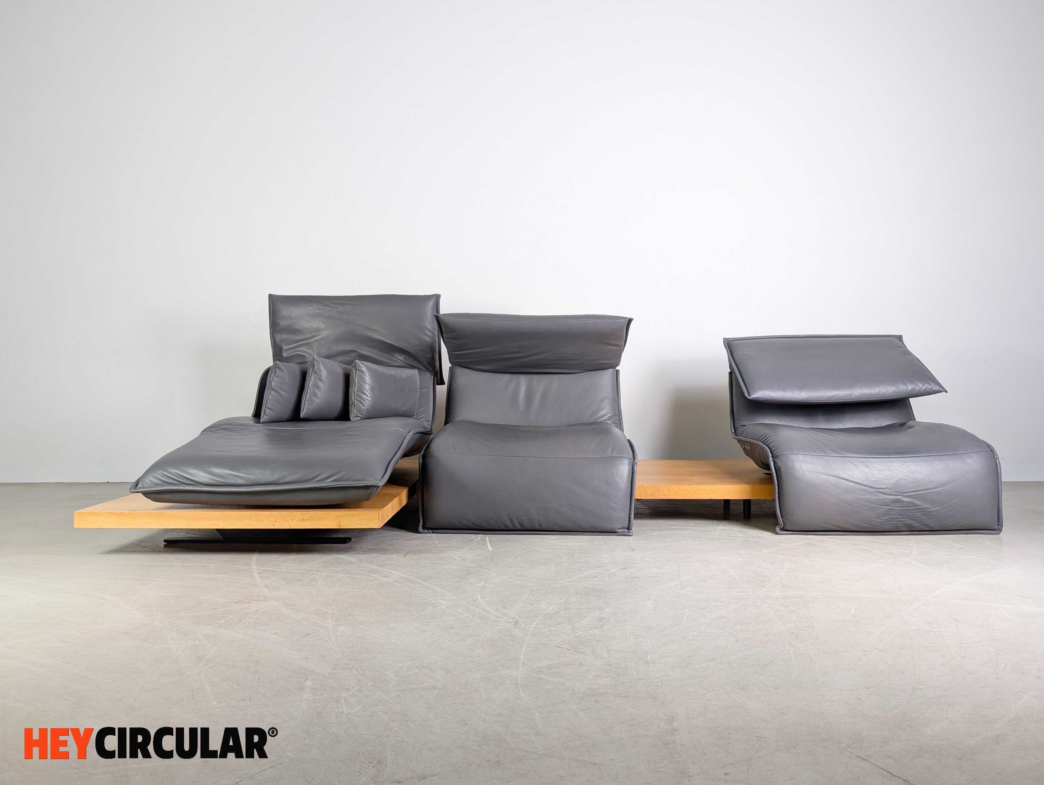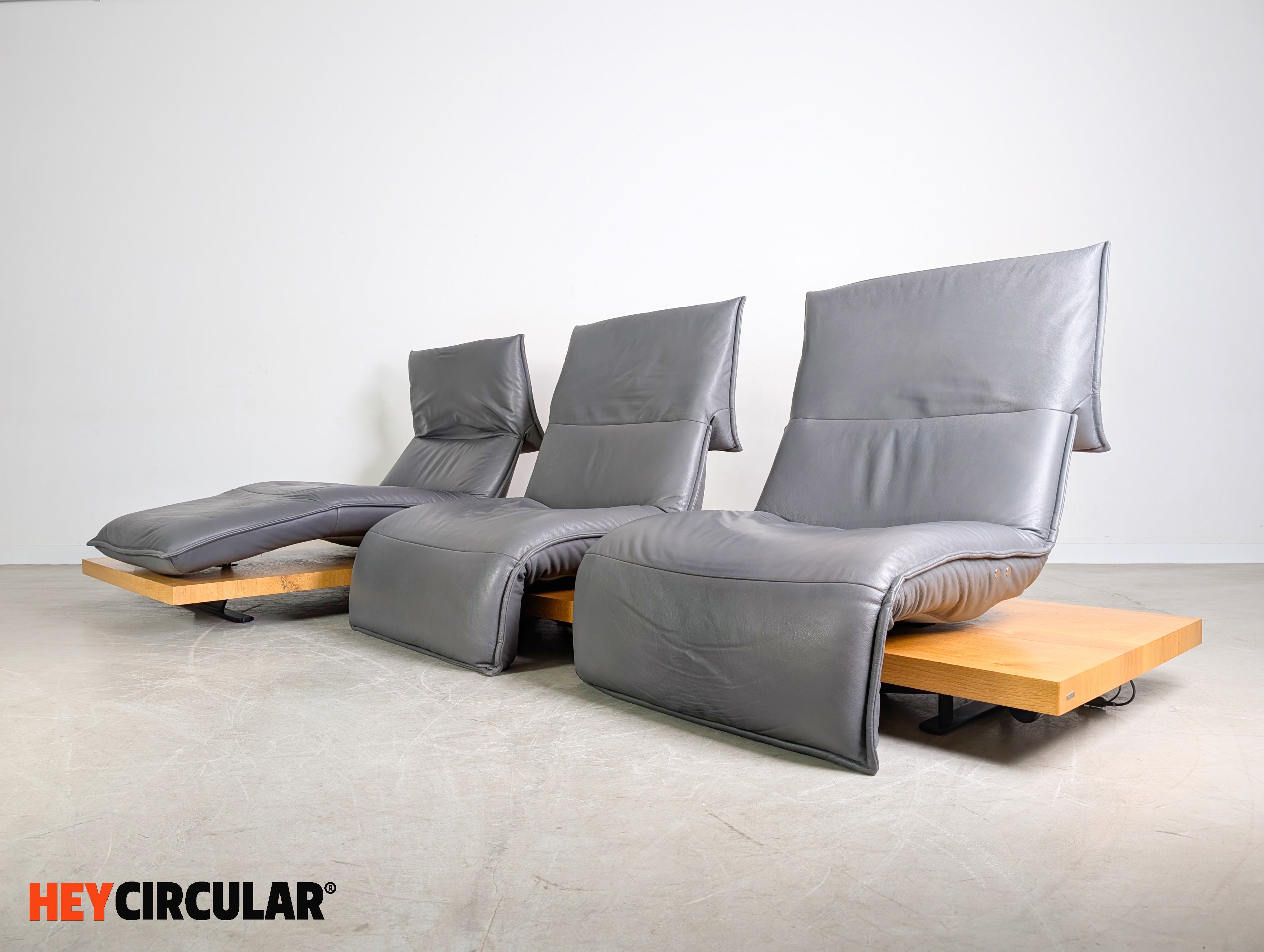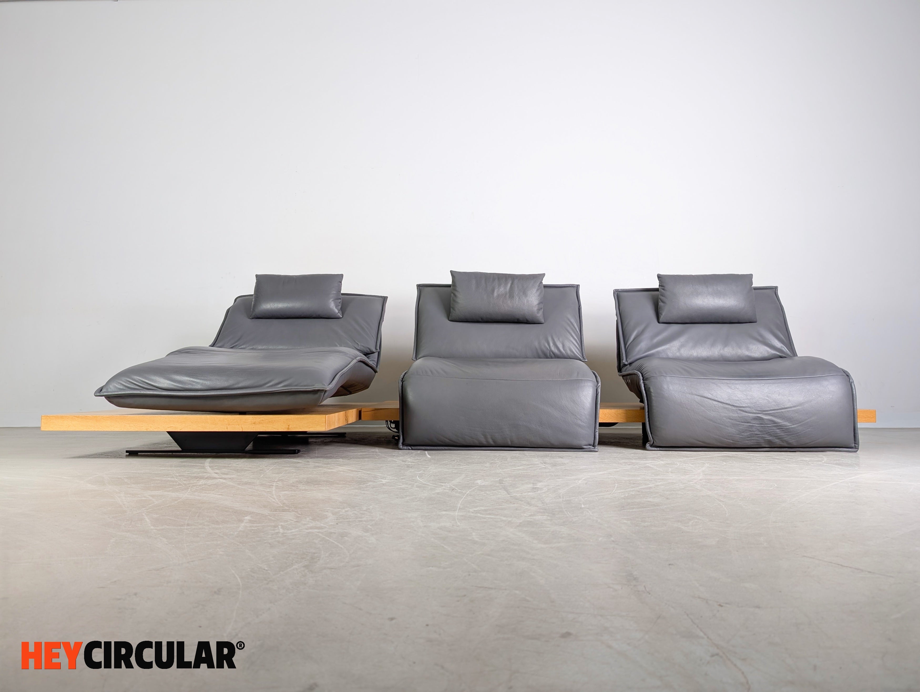 Wir bieten ein wunderschönes Ecksofa Edit 2 Free Motion von Koinor zum Verkauf an. Das Sofa besteht aus zwei Modulen, die sich flexibel anordnen lassen. Die Holzpodeste aus Balkeneiche, sowie die Ledersitze in der Farbe "Buffallo concrete" wurden professionell aufgearbeitet. Bei den beiden einzelnen Sitzen lassen sich sowohl die Rückenlehnen, als auch die Fußstützen elektrisch verstellen. Einer der Sitze (mittlerer Sitz) lässt sich zudem stufenlos von links nach rechts fahren.