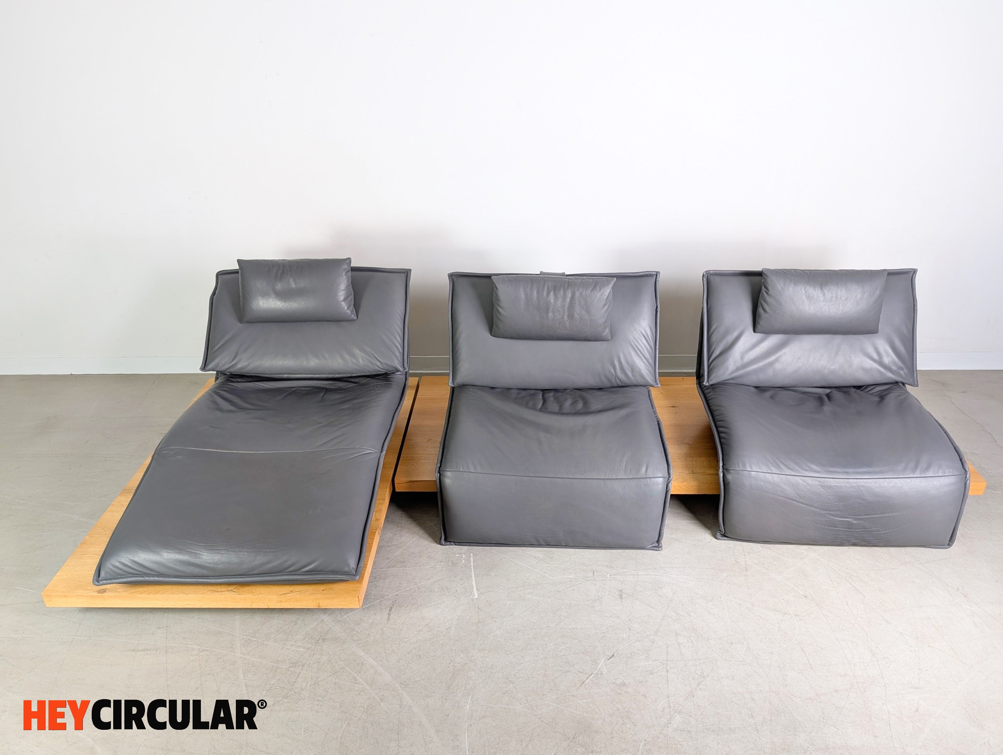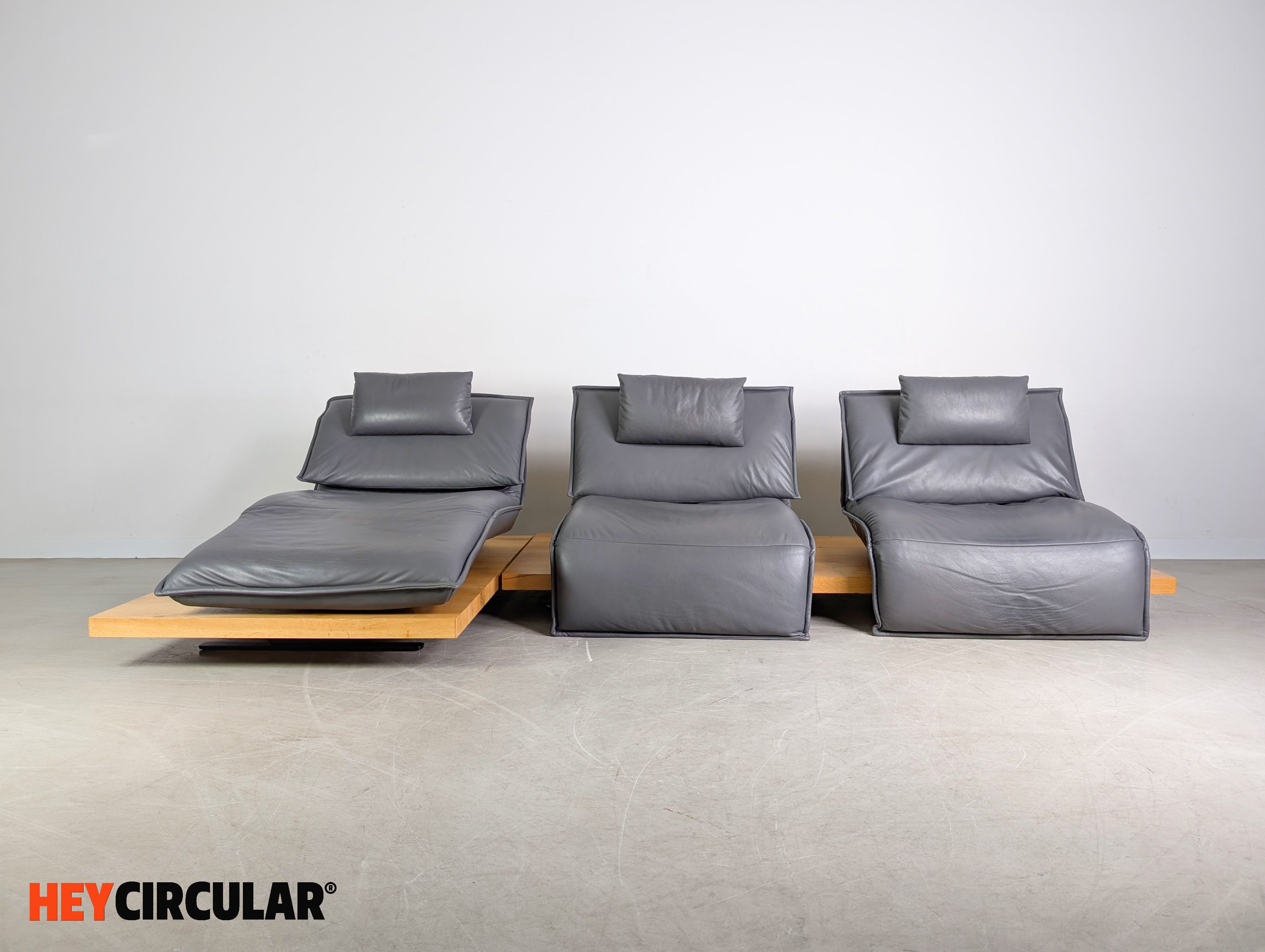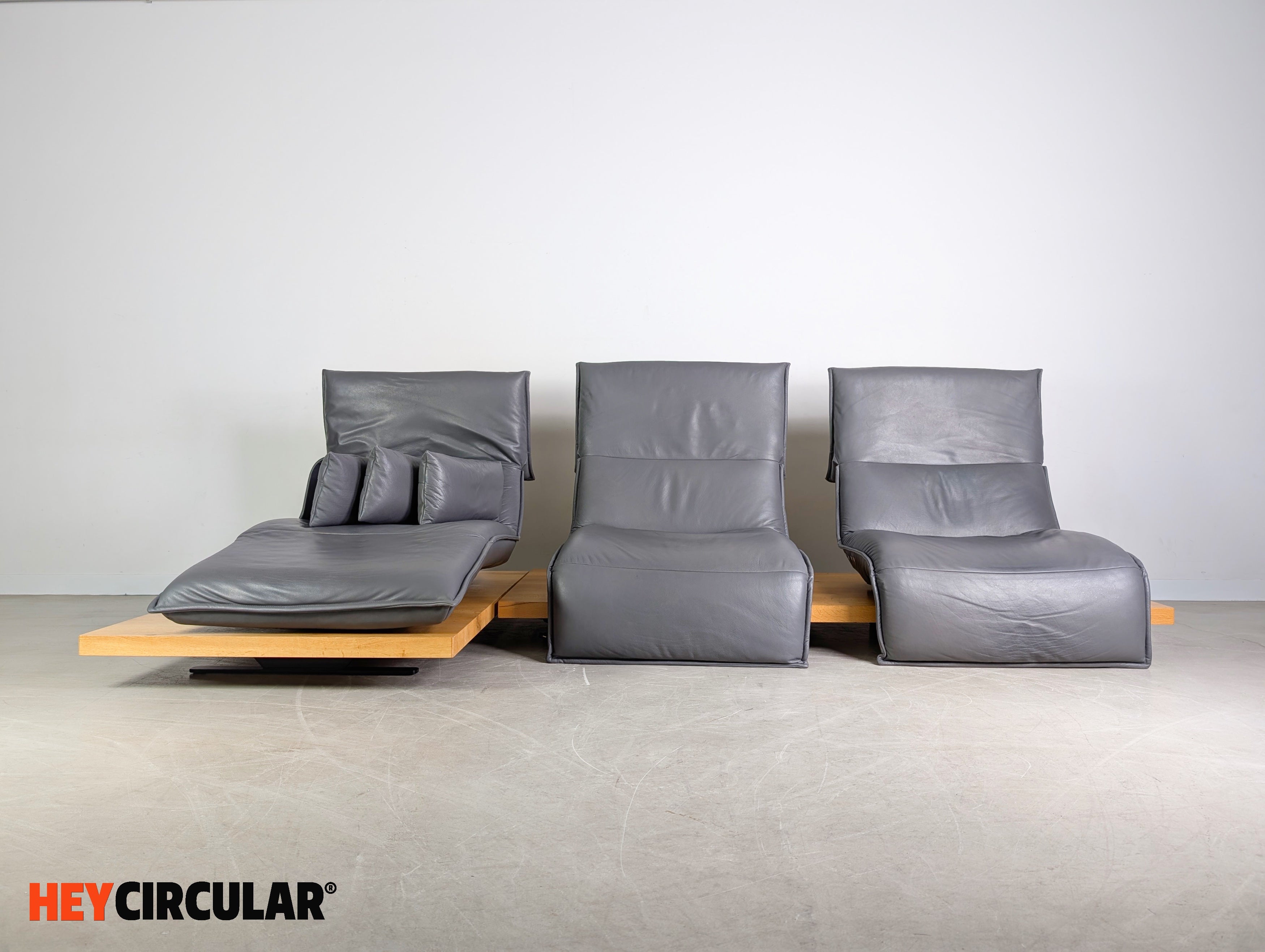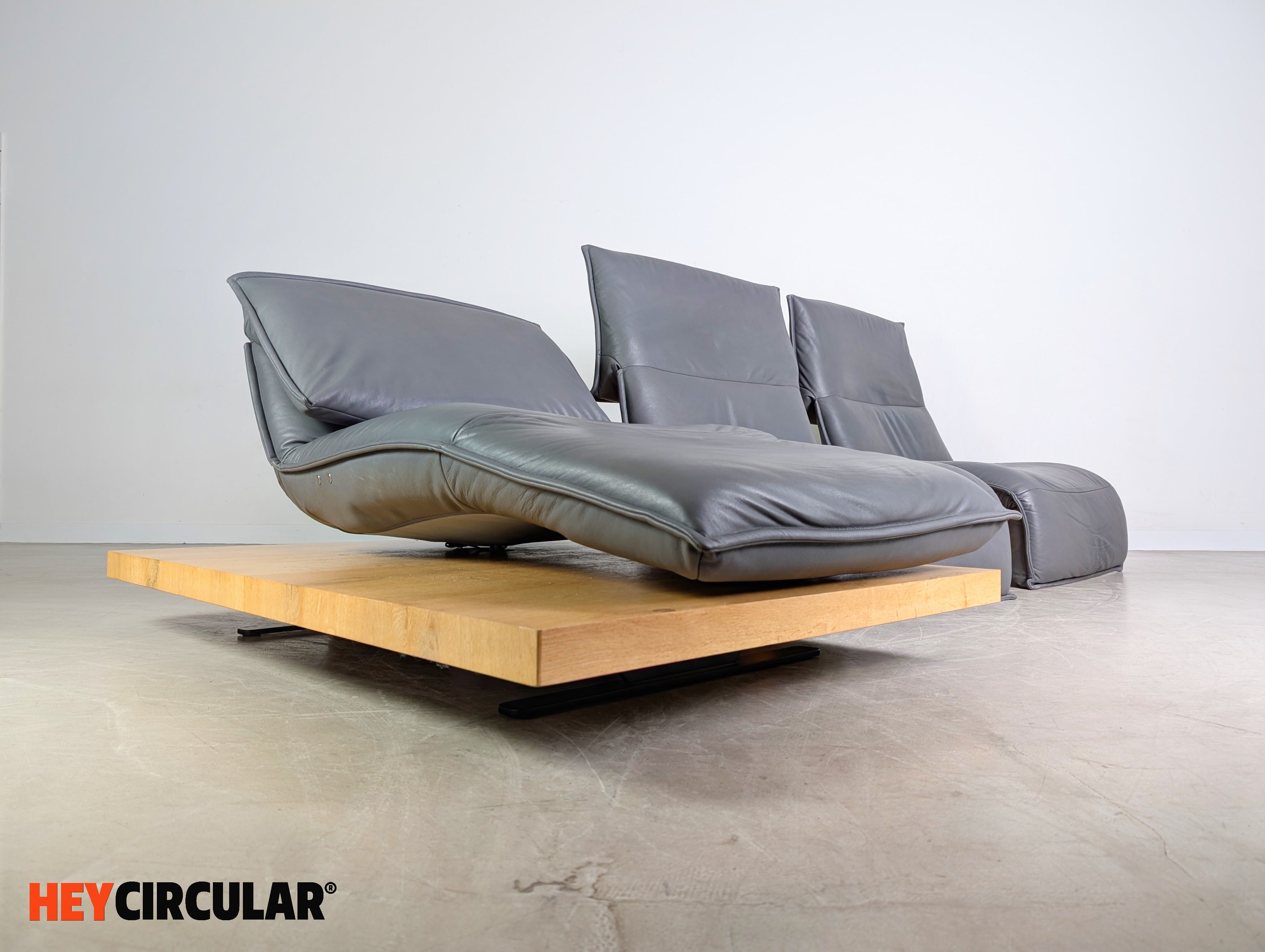 Wir bieten ein wunderschönes Ecksofa Edit 2 Free Motion von Koinor zum Verkauf an. Das Sofa besteht aus zwei Modulen, die sich flexibel anordnen lassen. Die Holzpodeste aus Balkeneiche, sowie die Ledersitze in der Farbe "Buffallo concrete" wurden professionell aufgearbeitet. Bei den beiden einzelnen Sitzen lassen sich sowohl die Rückenlehnen, als auch die Fußstützen elektrisch verstellen. Einer der Sitze (mittlerer Sitz) lässt sich zudem stufenlos von links nach rechts fahren.