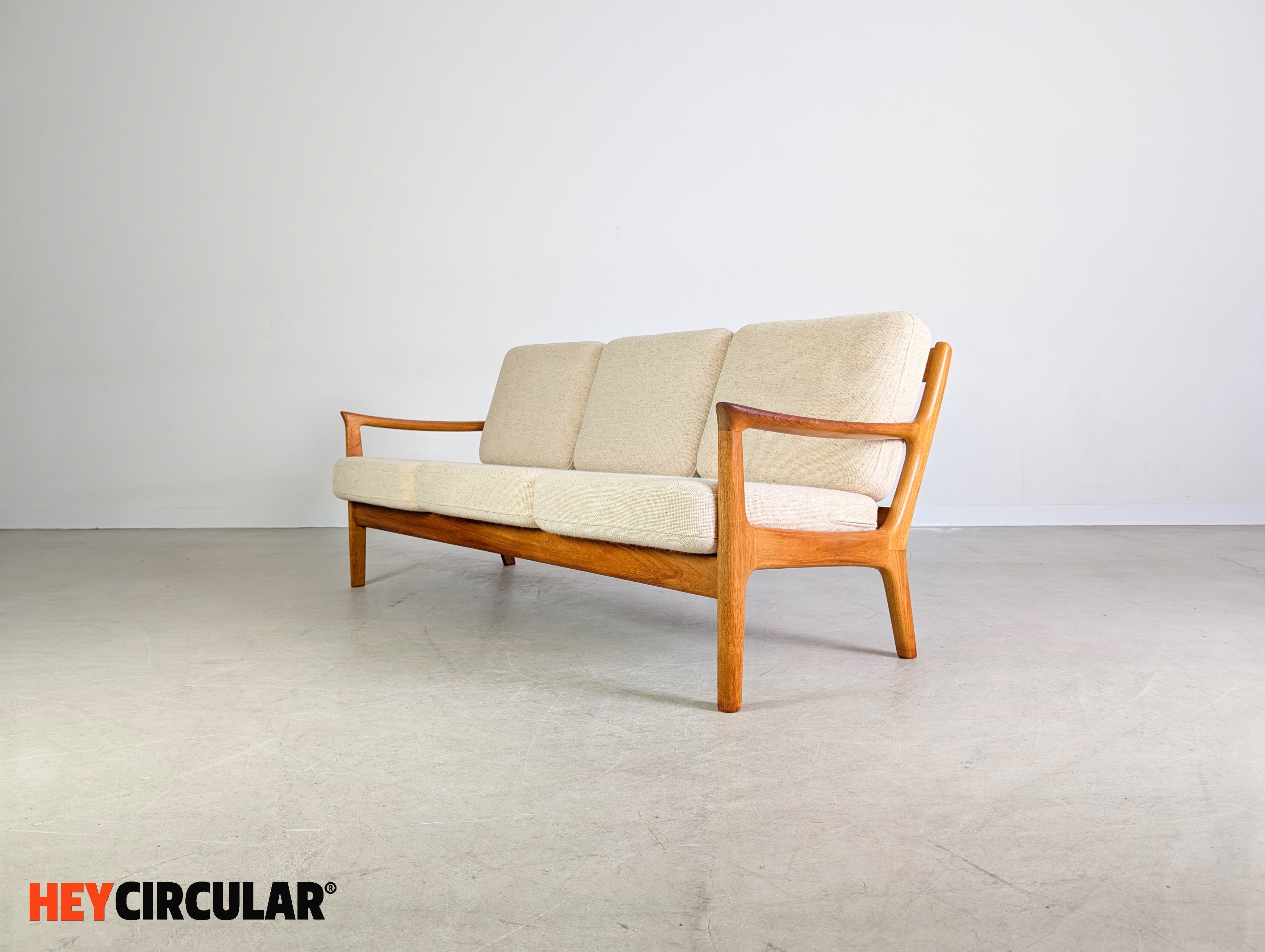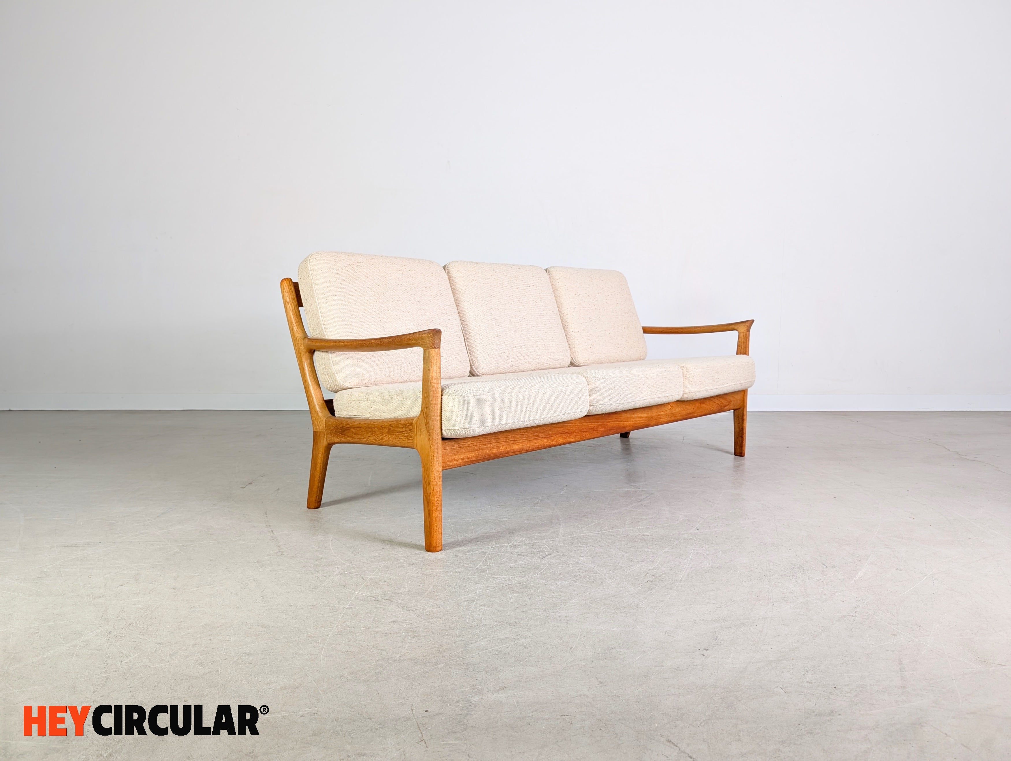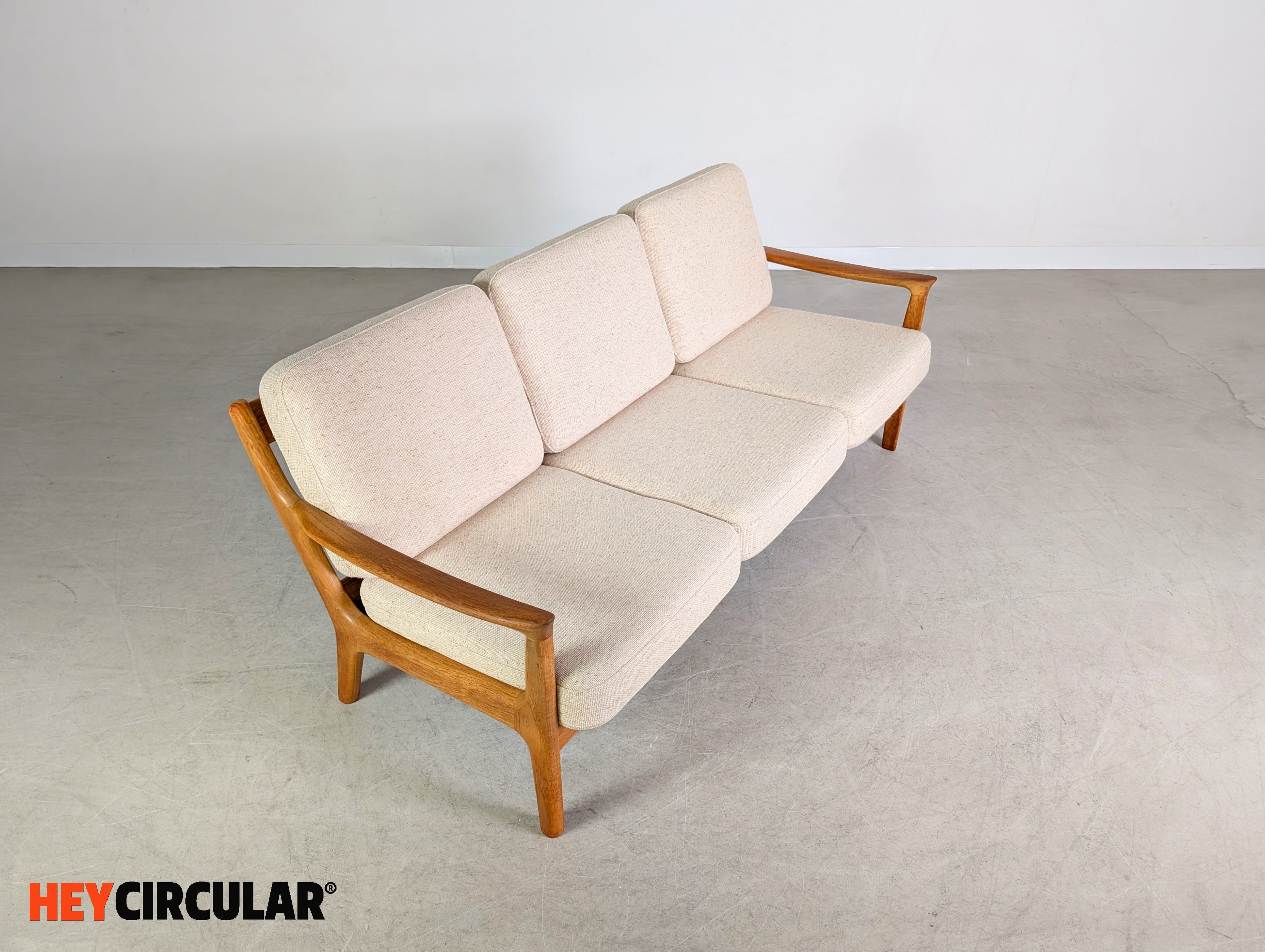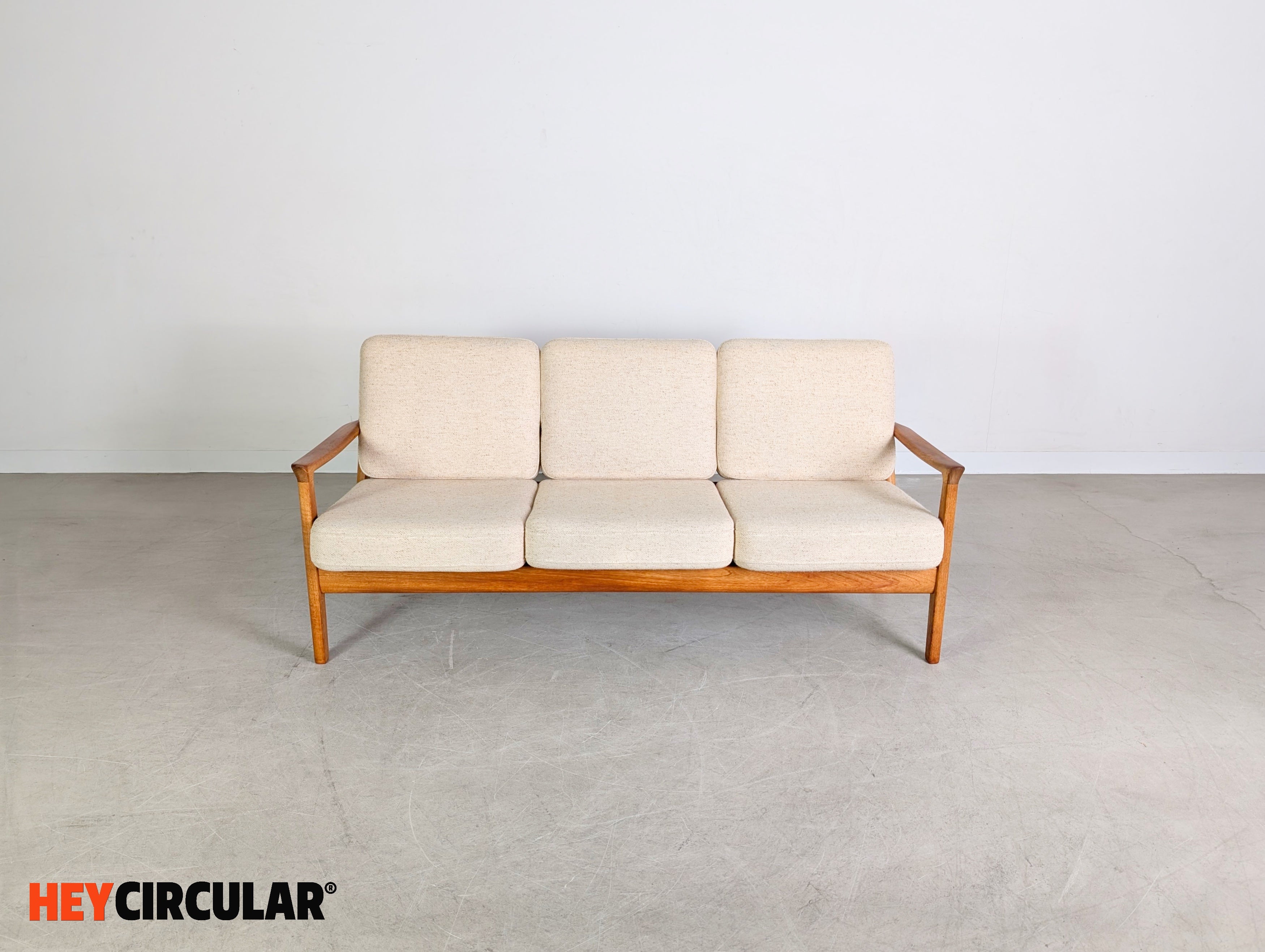Wir bieten einen wunderschönen Dreisitzer vom dänischen Traditionshersteller France & Son aus den 1960er Jahren zum Verkauf an. Der Entwurf stammt von Ole Wanscher, ist bekannt unter dem Modellnamen "Senator" und gilt als einer der popülärsten Entwürfe des dänischen Möbeldesigns. In unseren anderen Anzeigen bieten wir zudem einen passenden Zweisitzer und zwei Sessel der gleichen Baureihe zum Verkauf an. Bei der Abnahme mehrerer Stücke ist ein günstigerer Setpreis möglich.