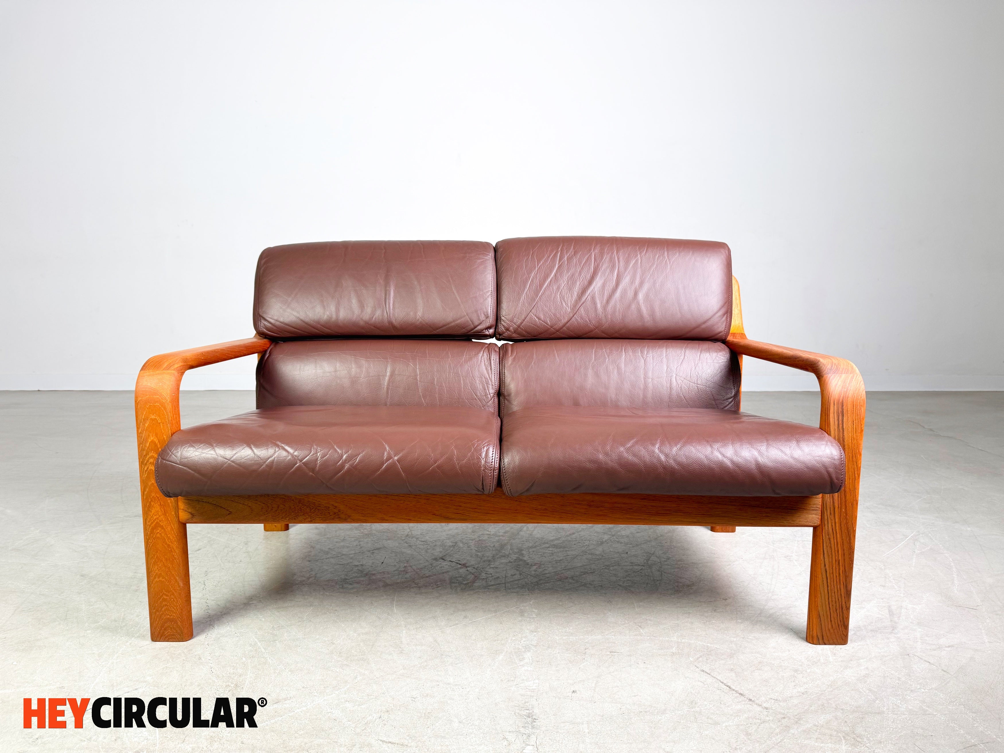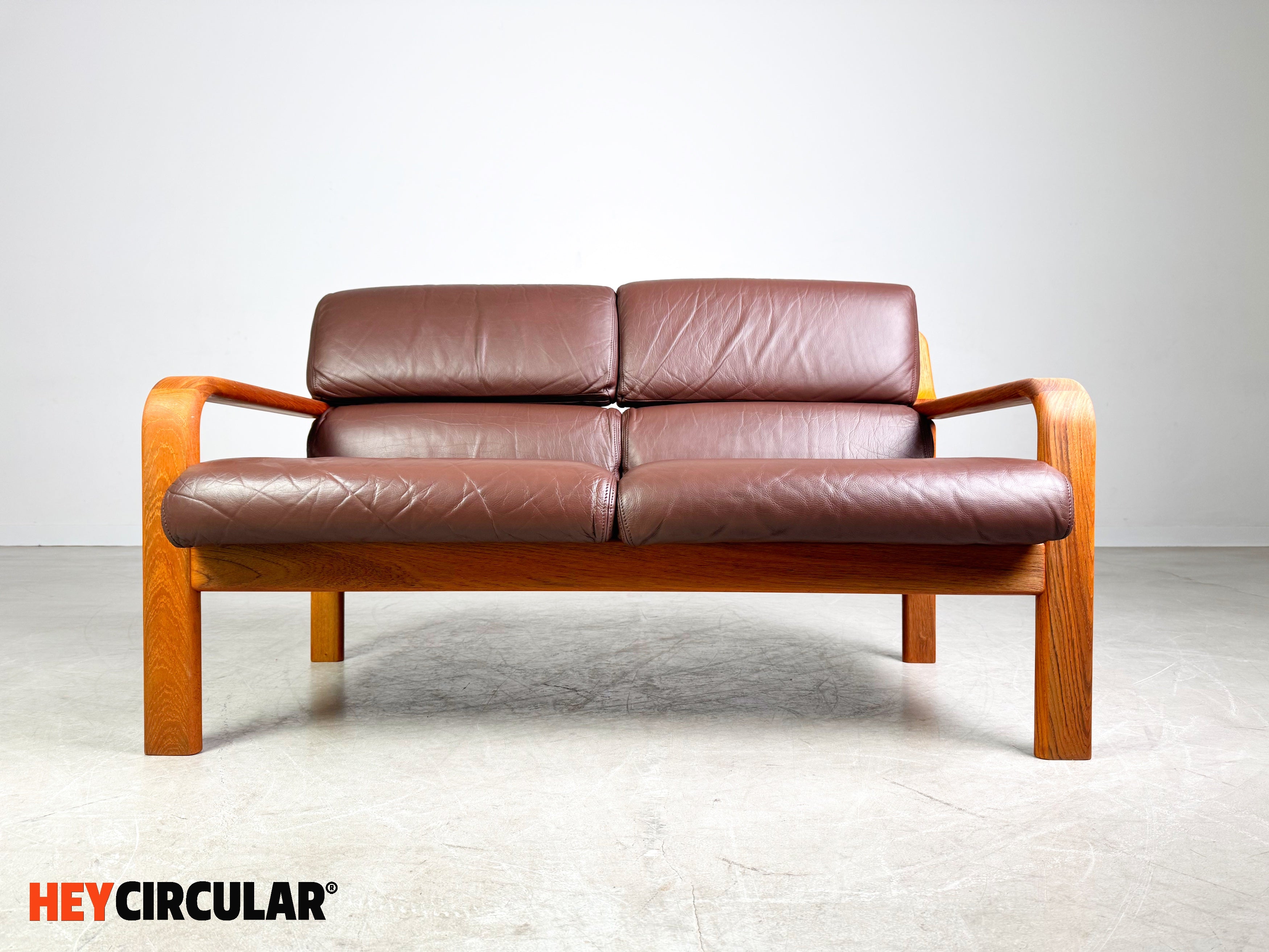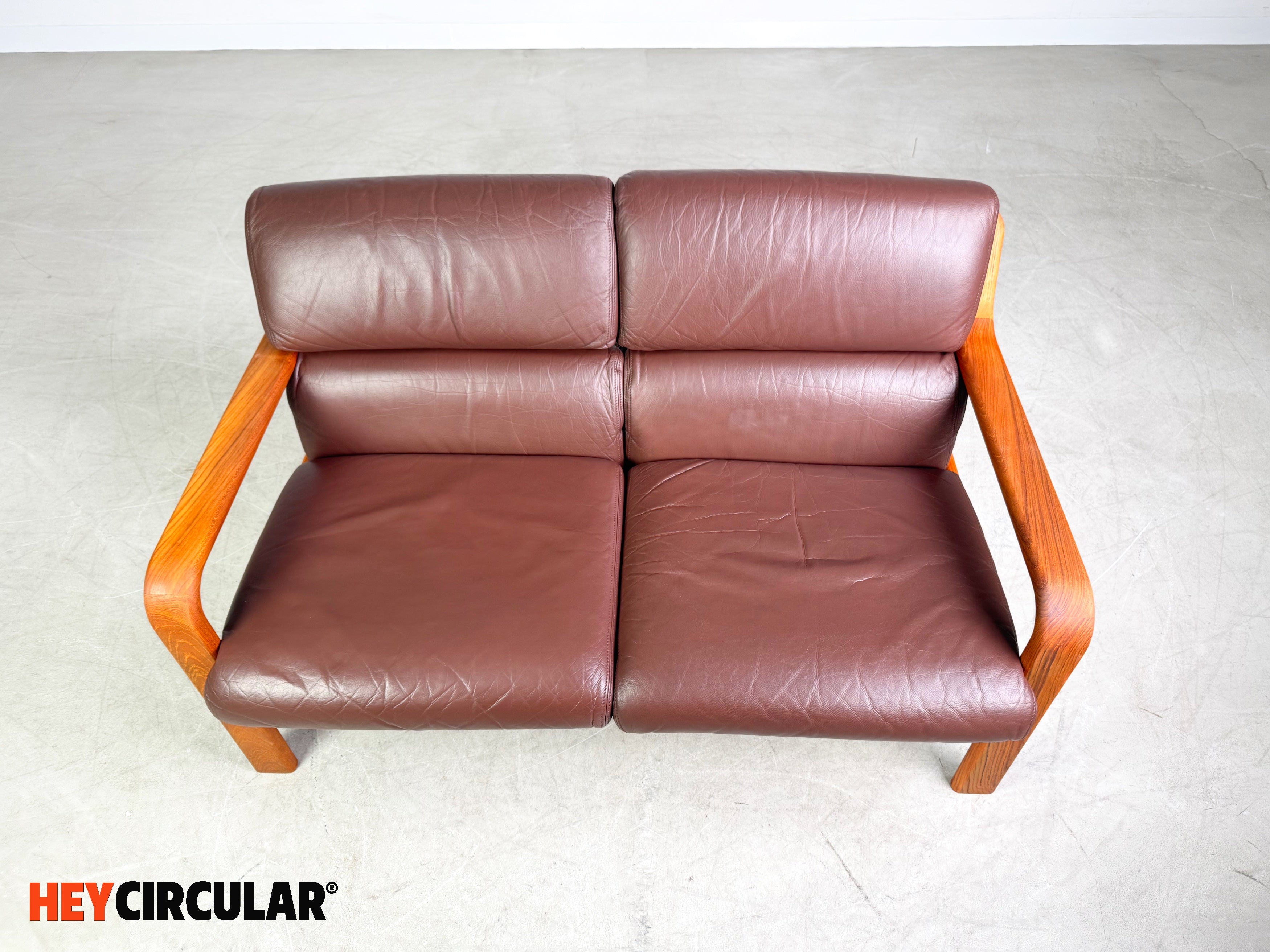 Wir bieten ein wunderschönes Zweisitzer Sofa von L.Olsen & Søn Møbelfabrik aus den 1970er Jahren zum Verkauf an. Das Sofa verfügt über bequeme und mit braunem Leder bezogene Polster, dessen Rückenteile mit Druckknöpfen an der Lehne befestigt werden können. In unseren anderen Anzeigen bieten wir ein passendes Dreisitzer Sofa der gleichen Baureihe und den gleichen Polstern/Bezügen.