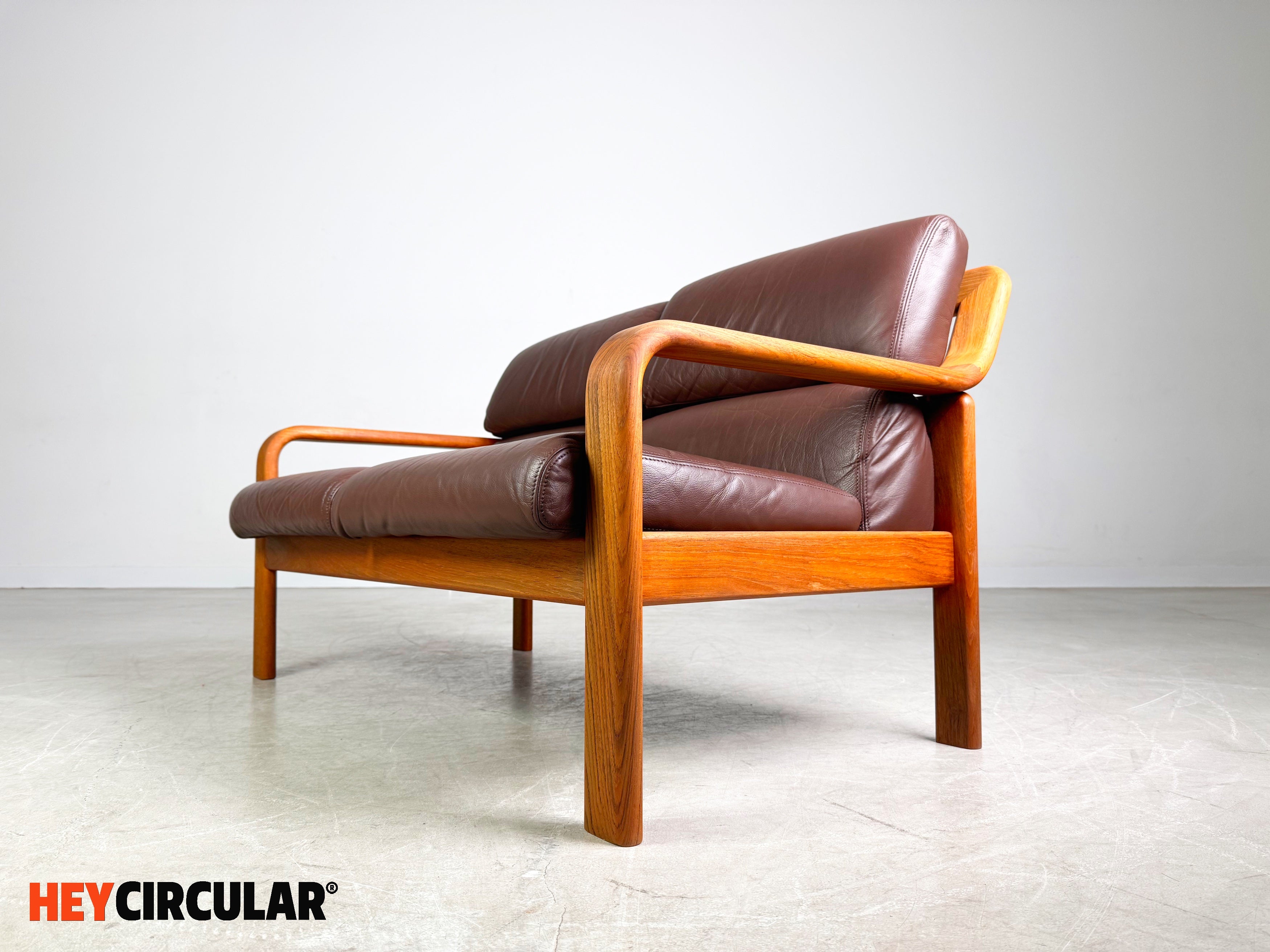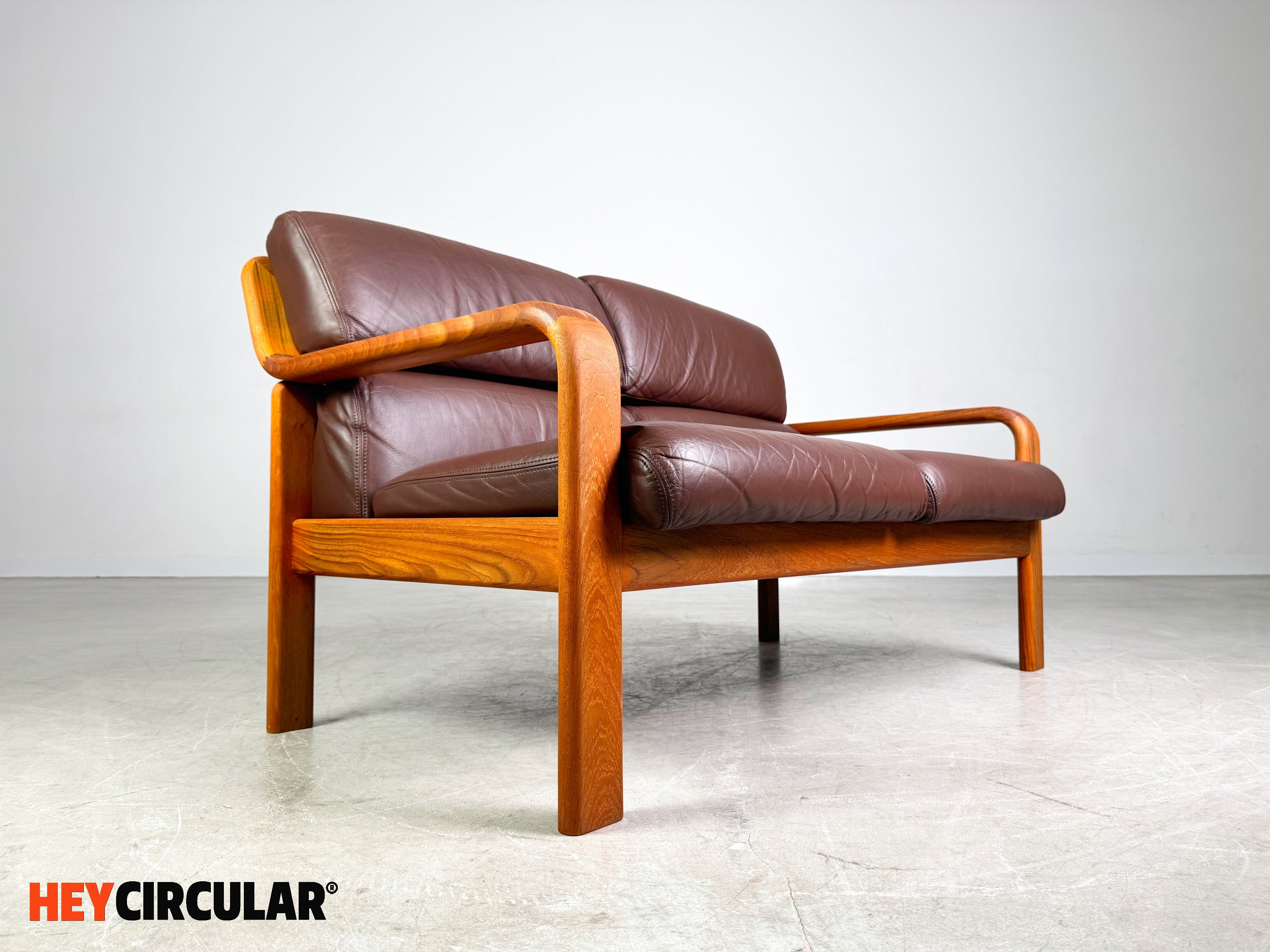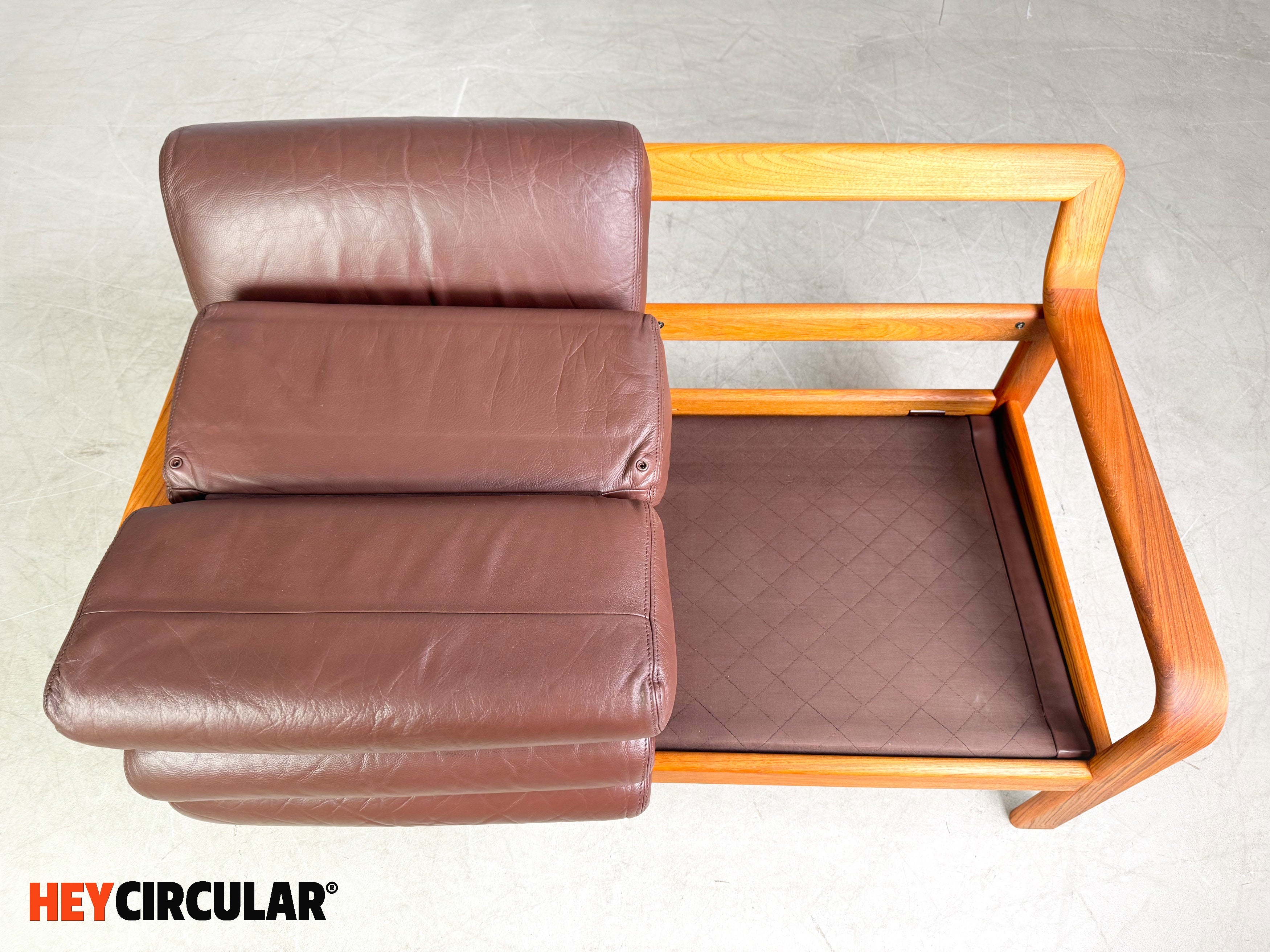 Wir bieten ein wunderschönes Zweisitzer Sofa von L.Olsen & Søn Møbelfabrik aus den 1970er Jahren zum Verkauf an. Das Sofa verfügt über bequeme und mit braunem Leder bezogene Polster, dessen Rückenteile mit Druckknöpfen an der Lehne befestigt werden können. In unseren anderen Anzeigen bieten wir ein passendes Dreisitzer Sofa der gleichen Baureihe und den gleichen Polstern/Bezügen.