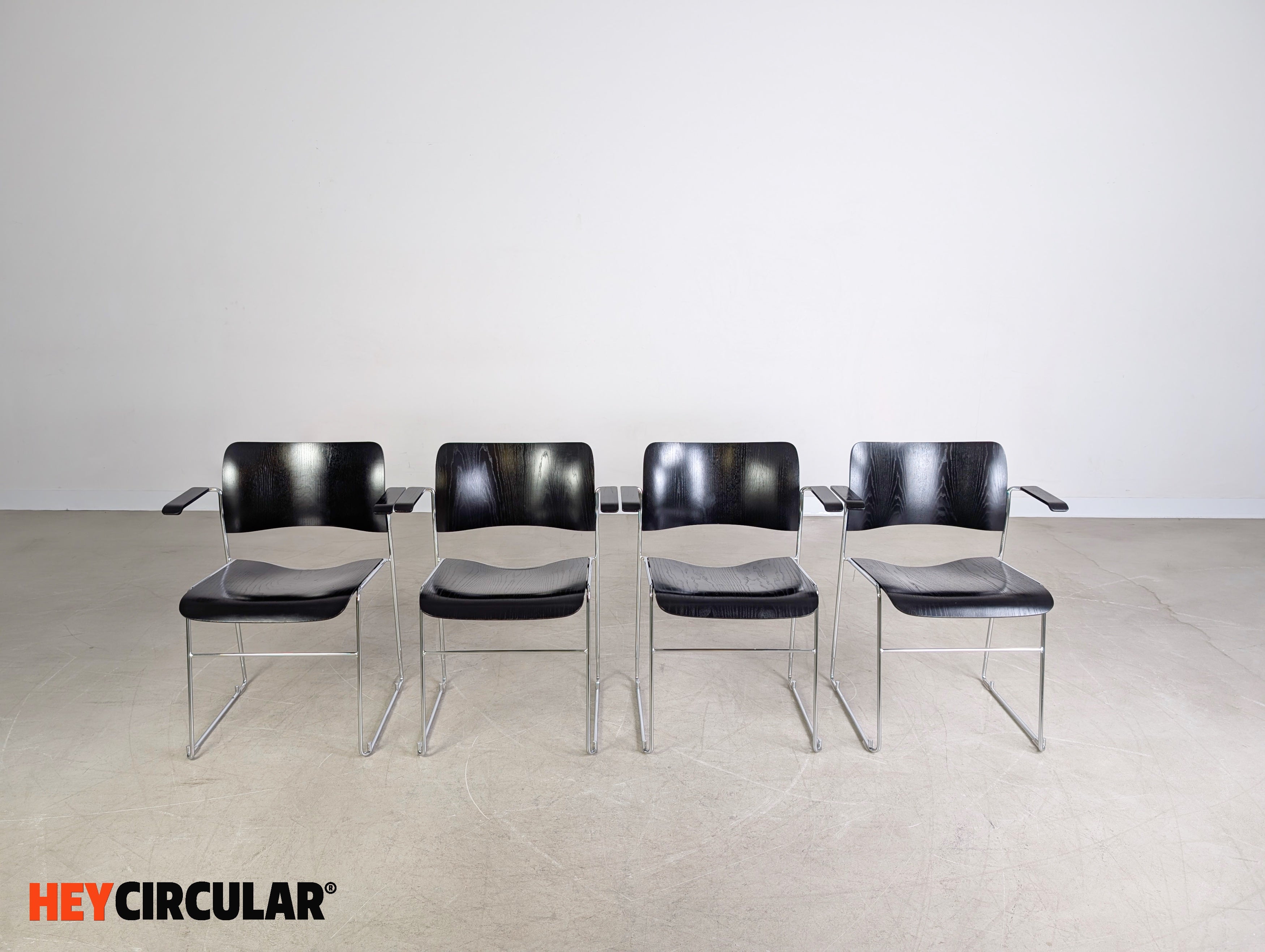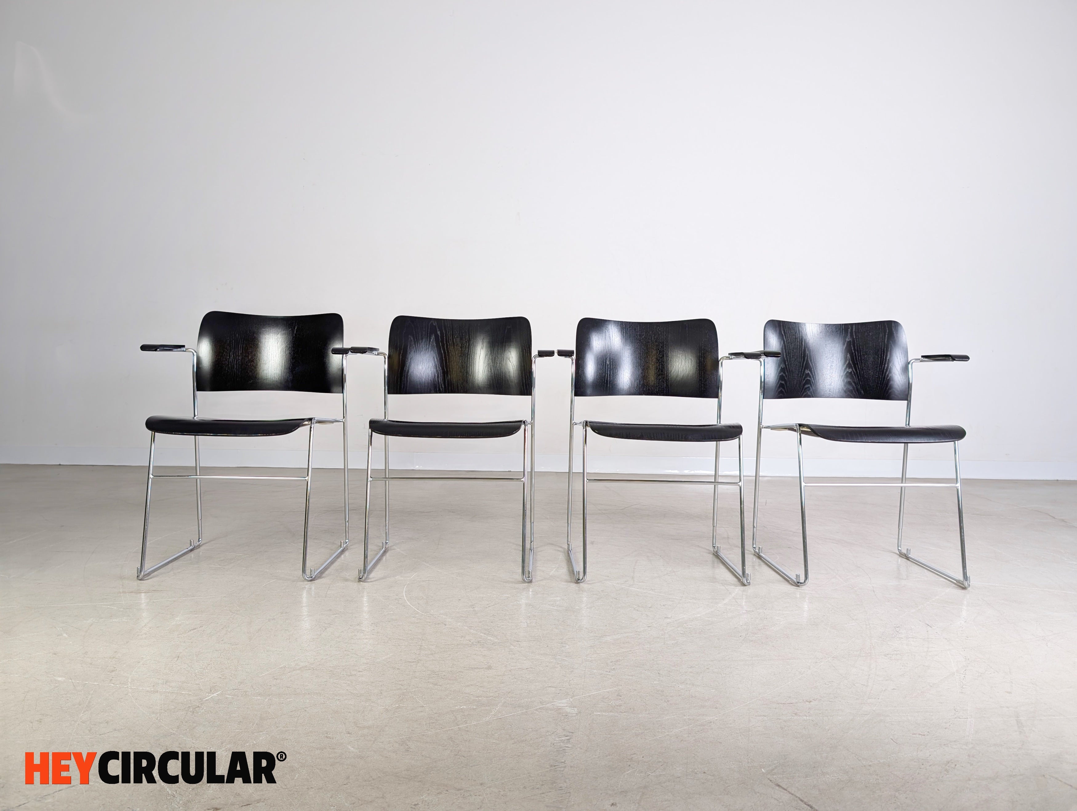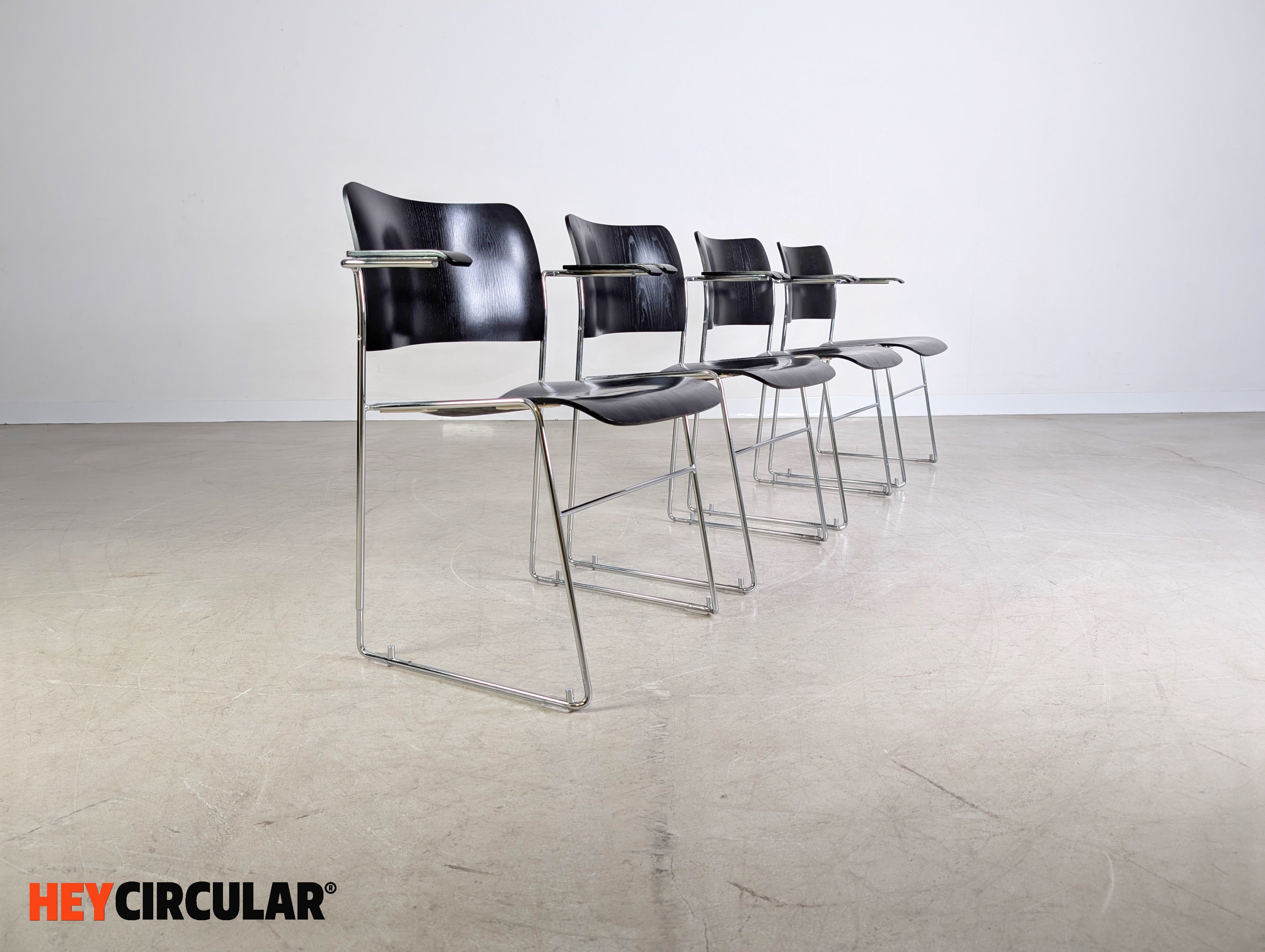Wir bieten ein wunderschönes und äußerst seltenes 4er Set Stapelstühle von Howe zum Verkauf an. Die Stühle sind unter dem Modellnamen 40/4 bekannt und wurden von David Rowland entworfen. Bei den angebotenen Exemplaren handelt es sich um die begehrte Version mit Armlehnen, wovon wir insgesamt 10 Stück auf Lager haben.