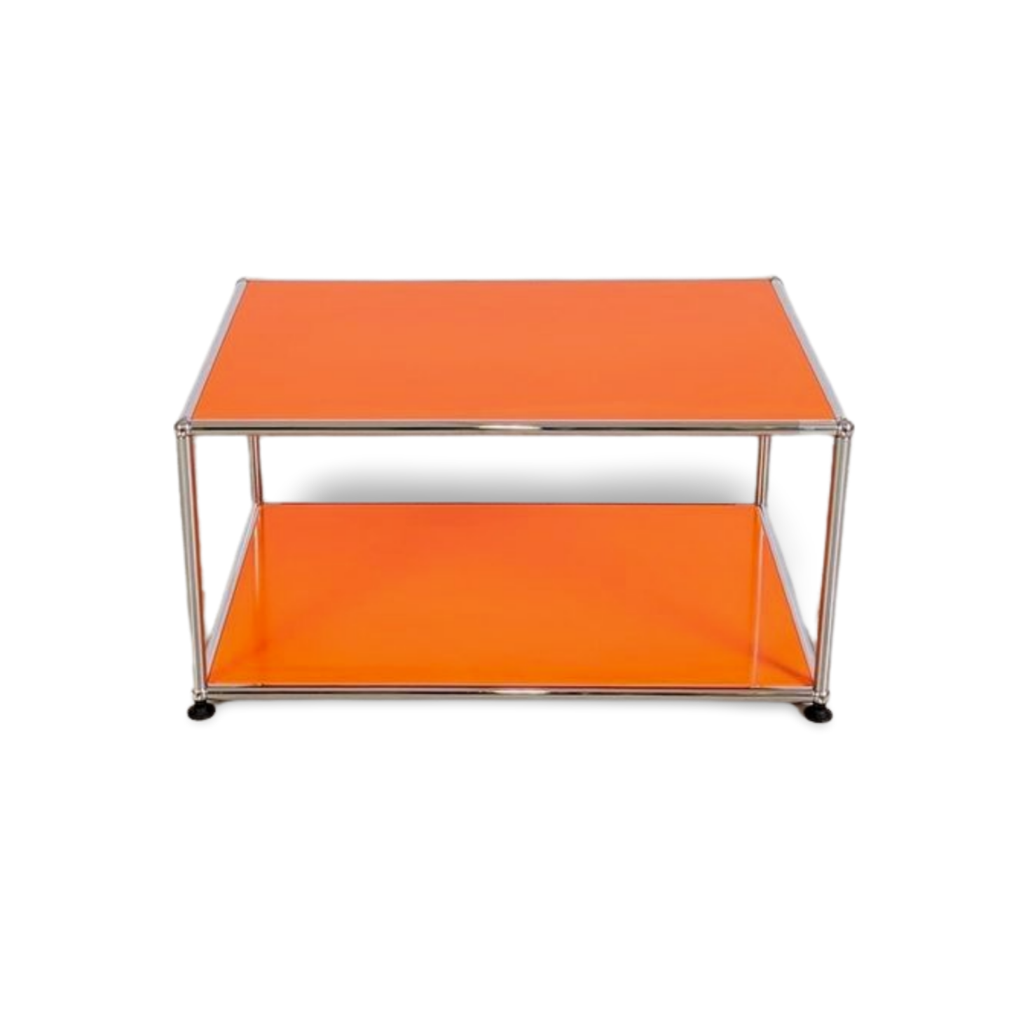 Wir bieten einen wunderschönen Couchtisch vom Schweizer Traditionshersteller USM Haller zum Verkauf an. Der Tisch, der mit knalligen, orangenen Metalleinlagen ausgestattet ist, verfügt über eine Ablagefläche unten und eine mit 77cm Länge großzügige Tischplatte oben.