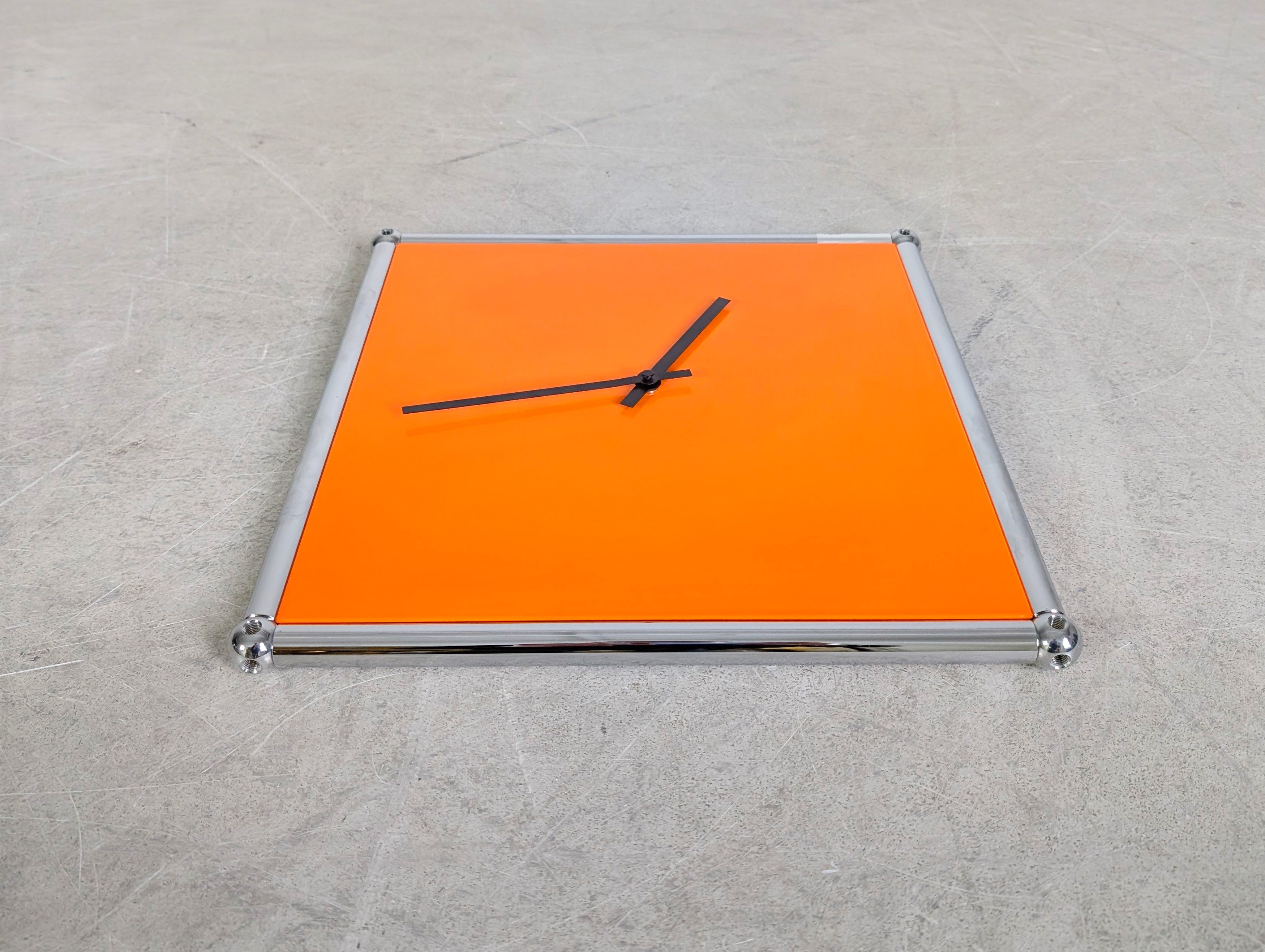 Wir bieten eine coole USM Haller Wanduhr in einem modernen orange zum Verkauf an. Die Uhr ist batteriebetrieben, verfügt über den USM Haller Aufkleber auf einer der Stangen und lässt sich mithilfe eines kleinen Rädchens kinderleicht und schnell einstellen.