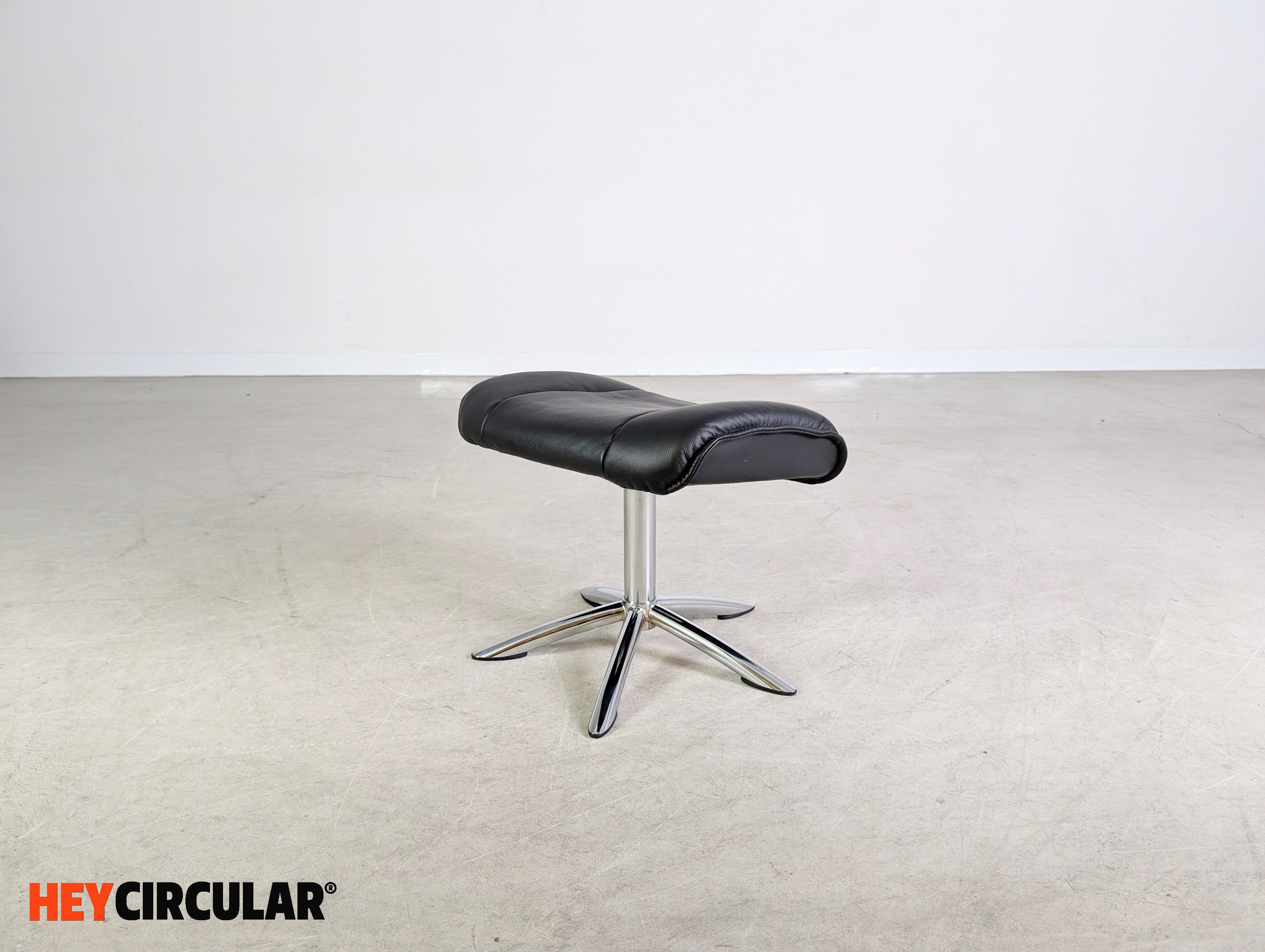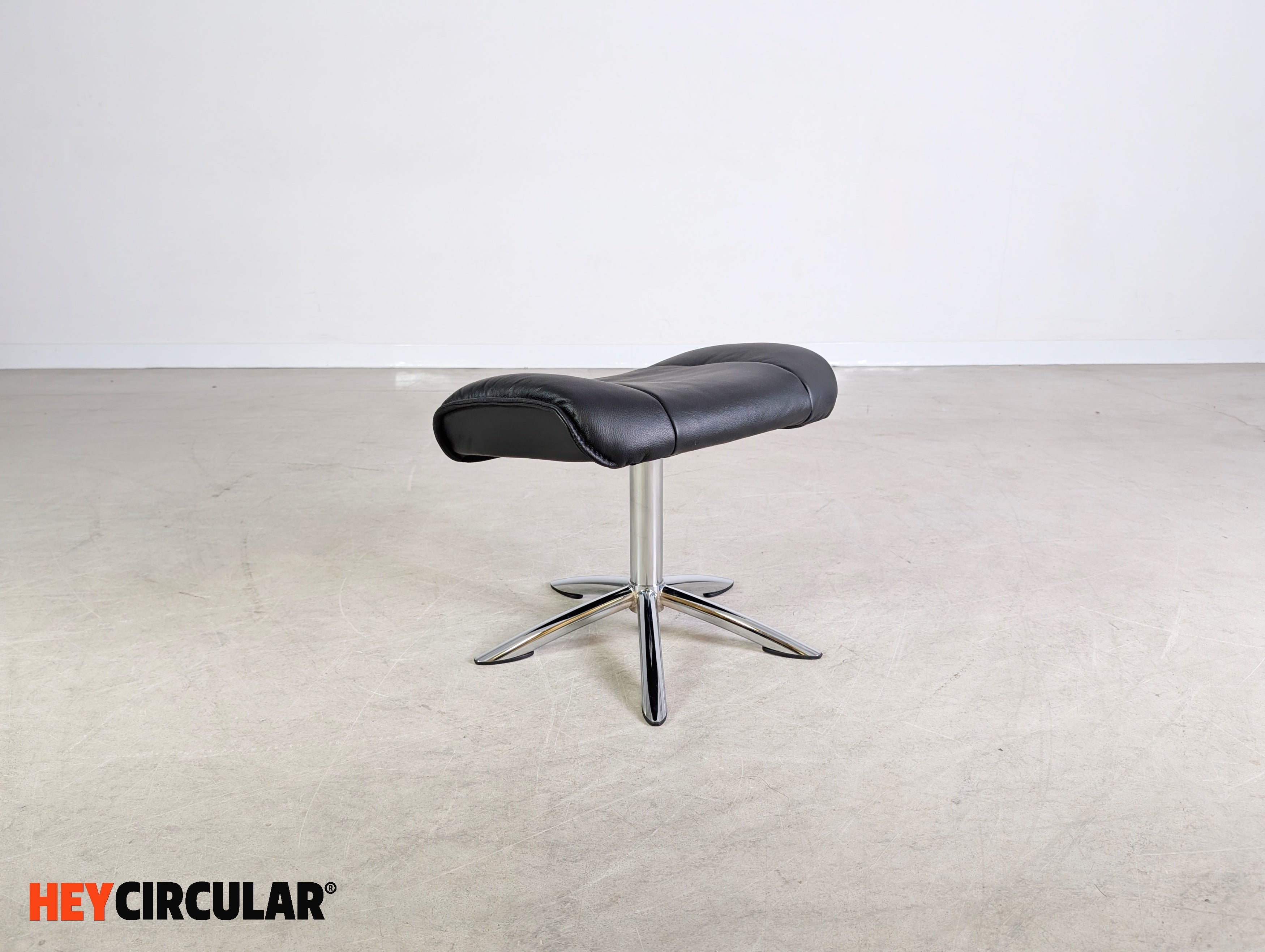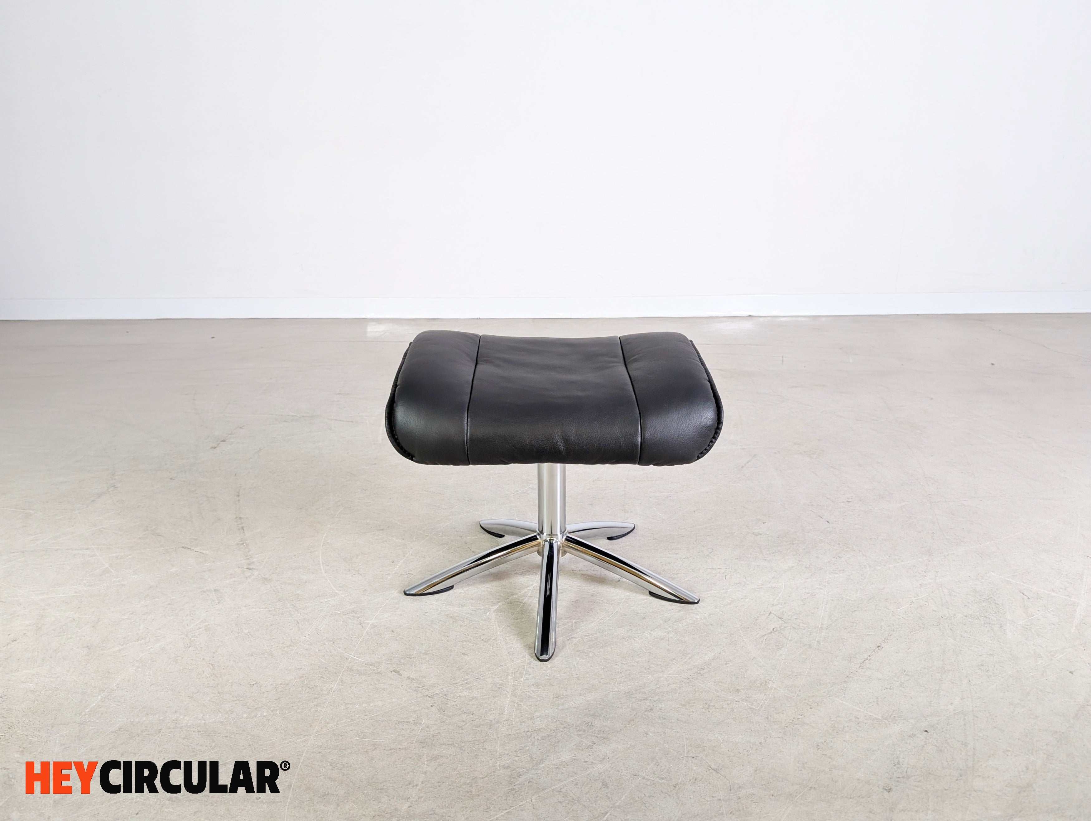 Wir bieten einen wunderschönen, drehbaren Fußhocker aus schwarzem Leder zum Verkauf an. Der Ottoman lässt sich ideal an eine bestehende Sitzgarnitur ergänzen oder auch unter dem Schreibtisch für eine bequeme Sitzposition nutzen.