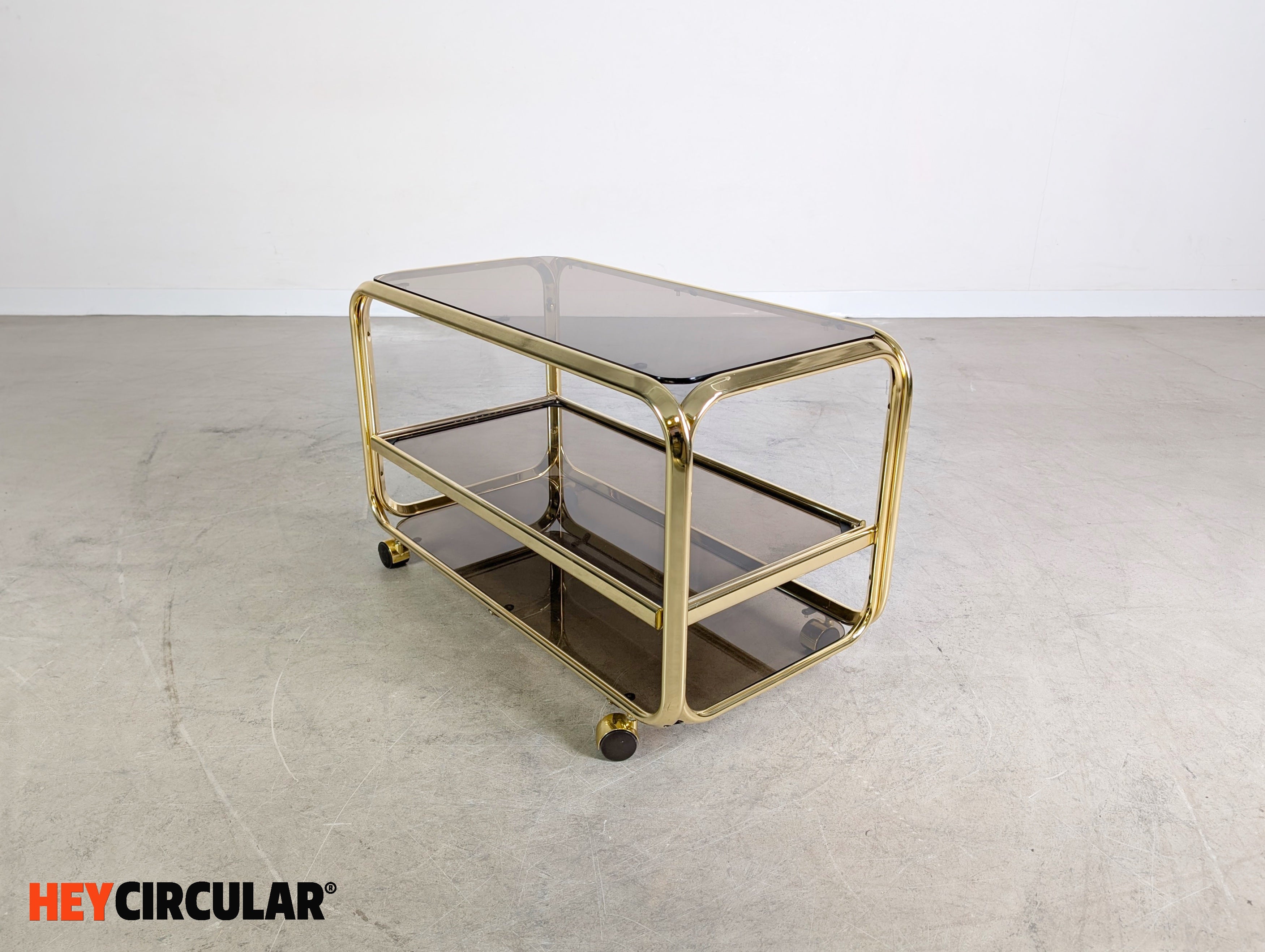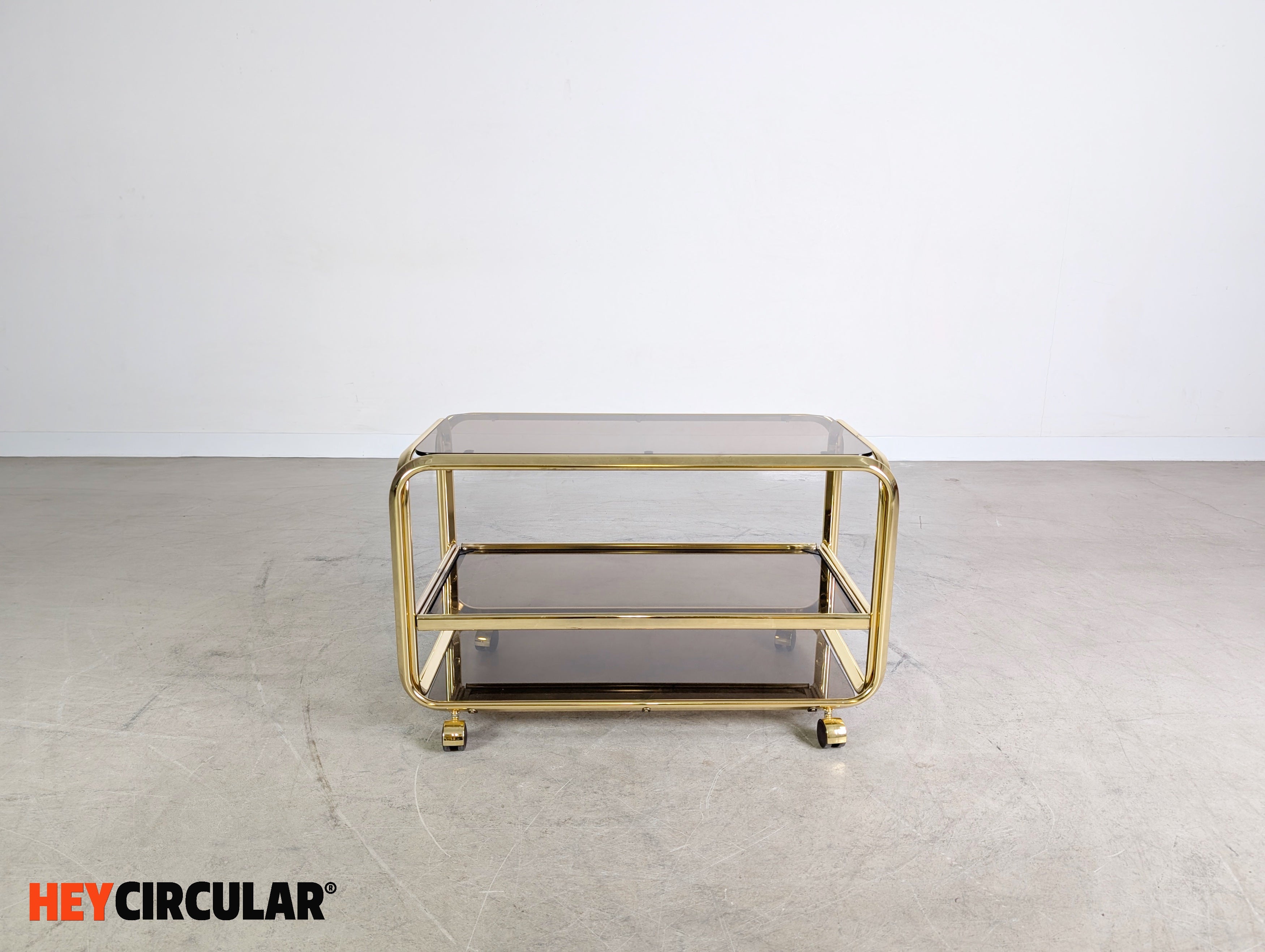 Wir bieten einen wunderschönen Vintage Servierwagen aus Messing und Rauchglas aus den 1970er Jahren zum Verkauf an. Das in Italien hergestellte Möbel bietet mit seinen zwei Ebenen viel Ablagefläche und lässt sich dank seiner Rollen flexibel im Alltag einsetzen.