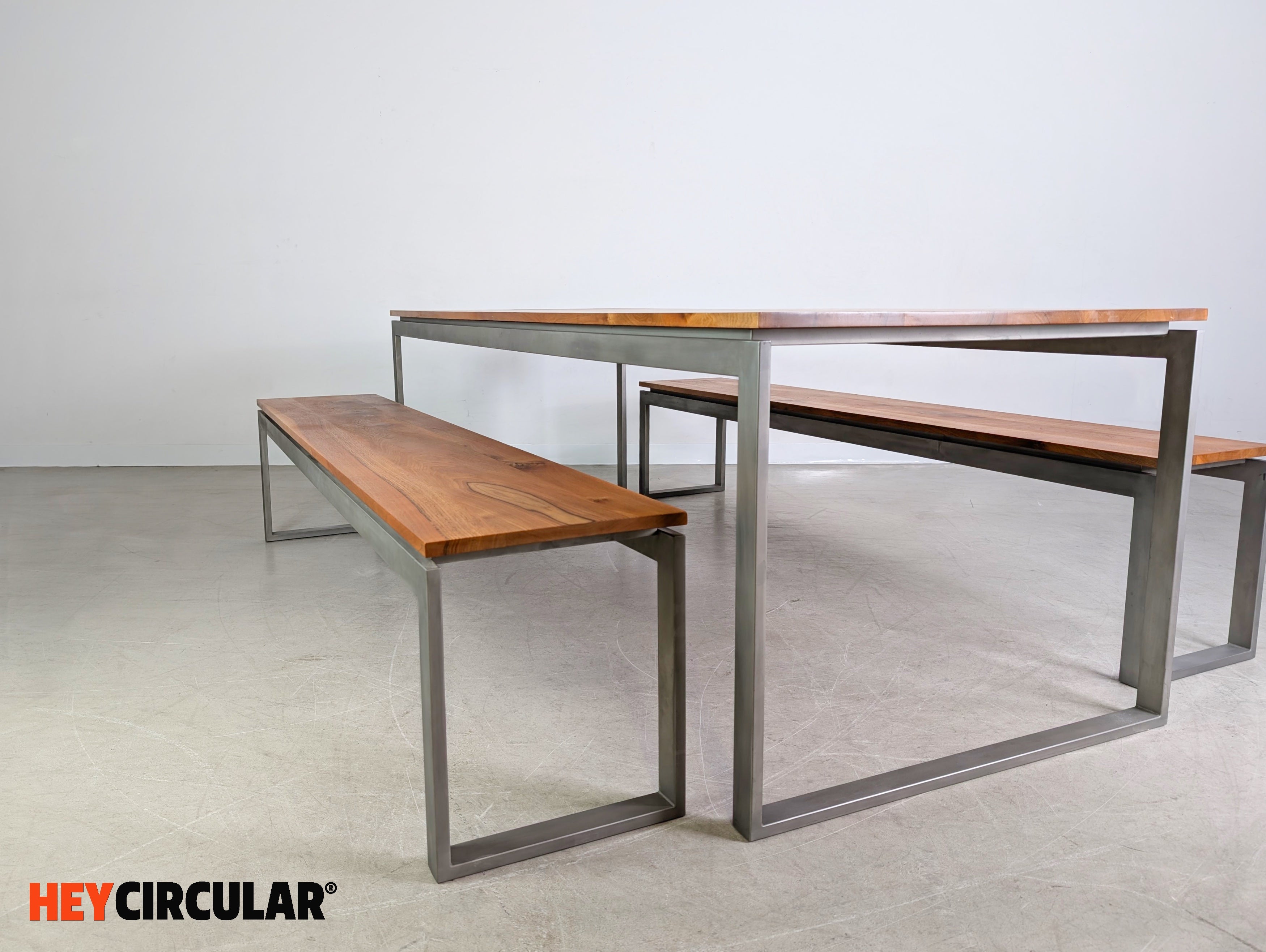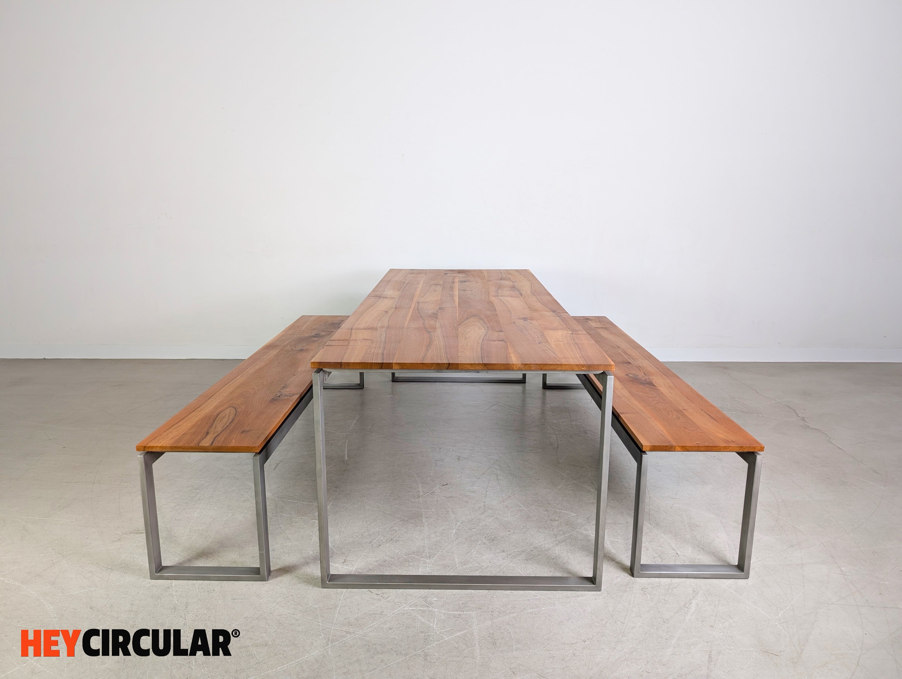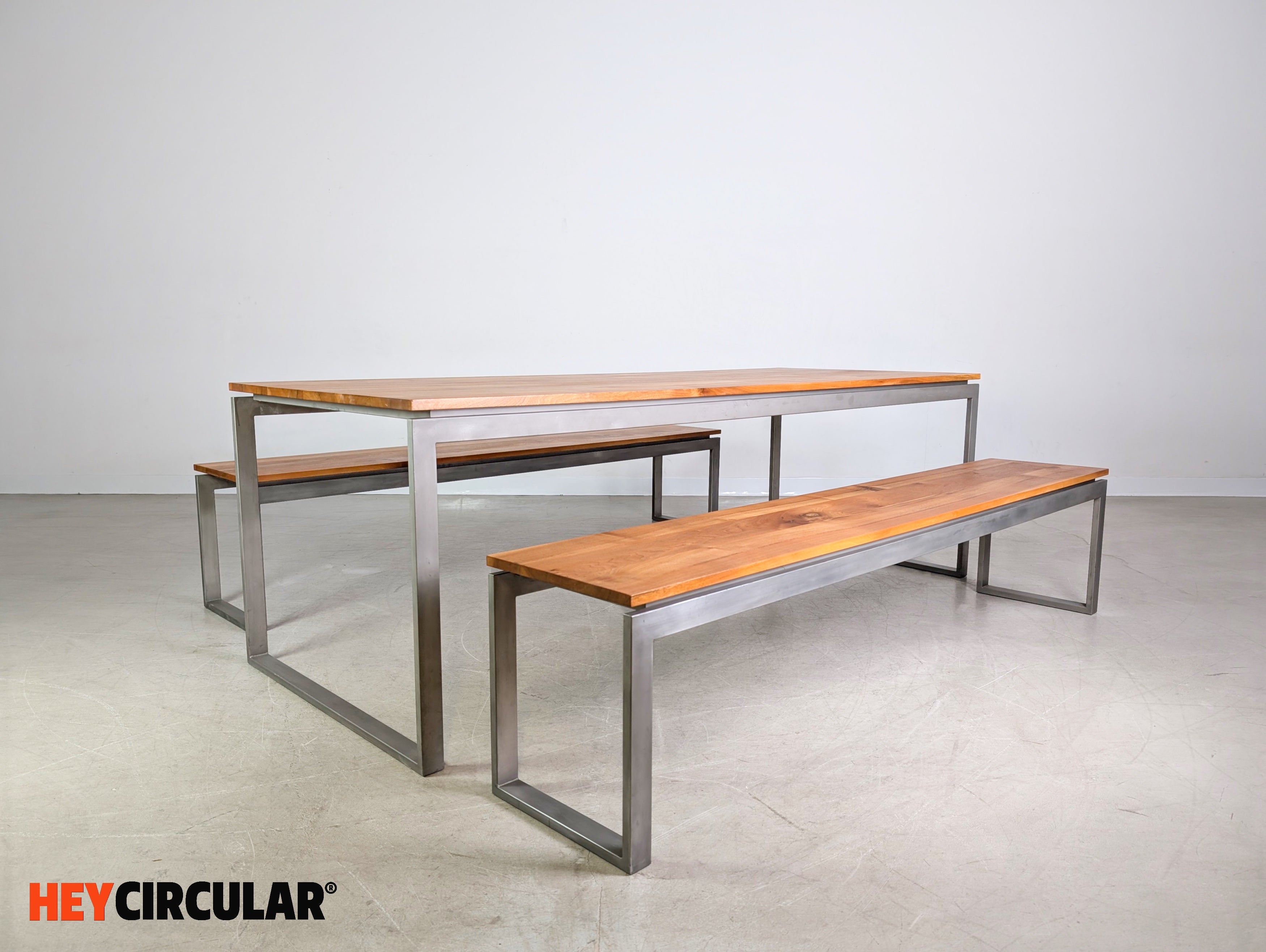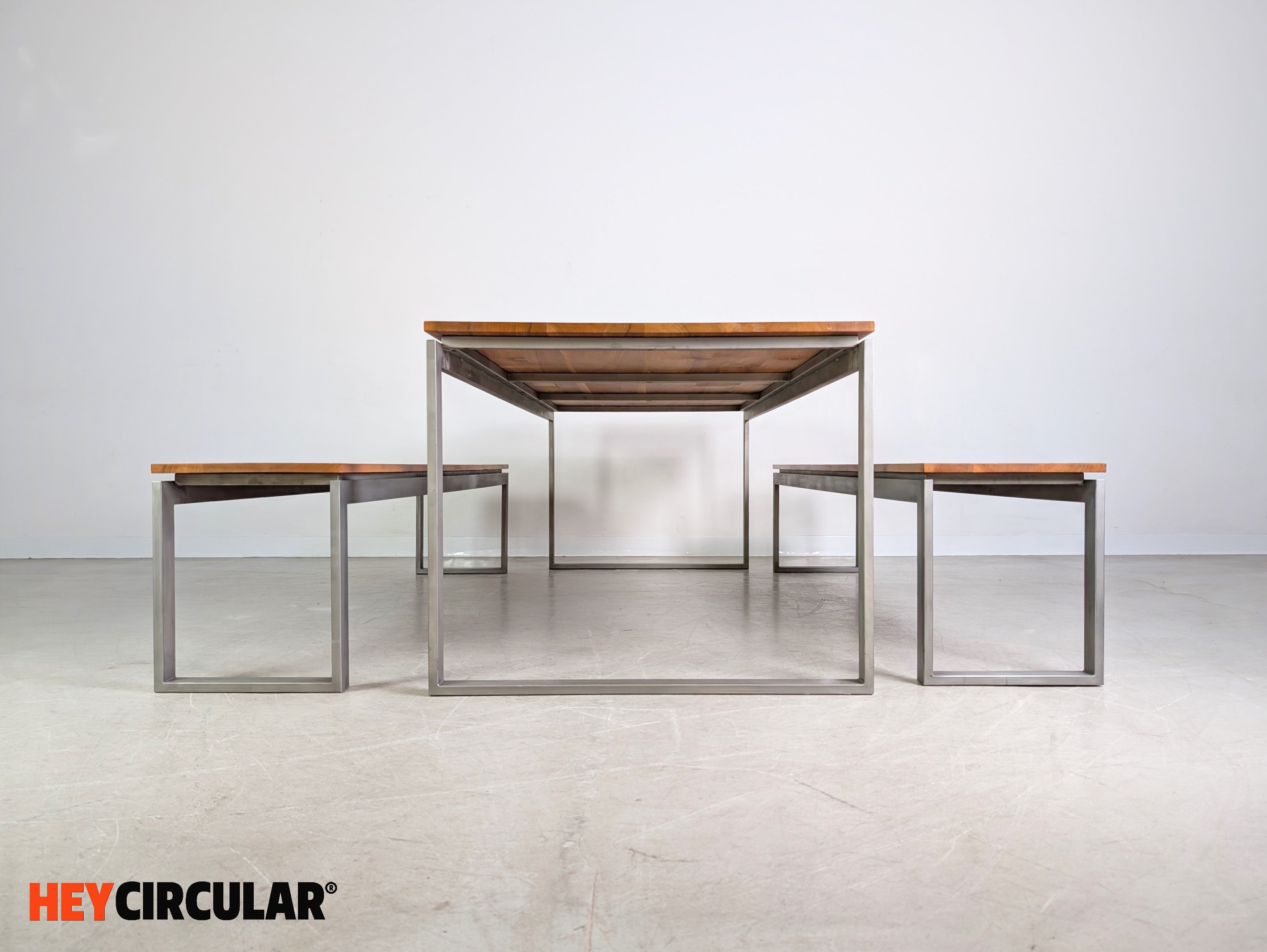 Wir bieten ein wunderschönes Esstisch Set bestehend aus einem Esstisch und zwei Sitzbänken. Die Möbel zeichnen sich durch ihr minimalistisches Design und dank der Stahlkonstruktionen ihre äußerst hohe Stabilität aus.