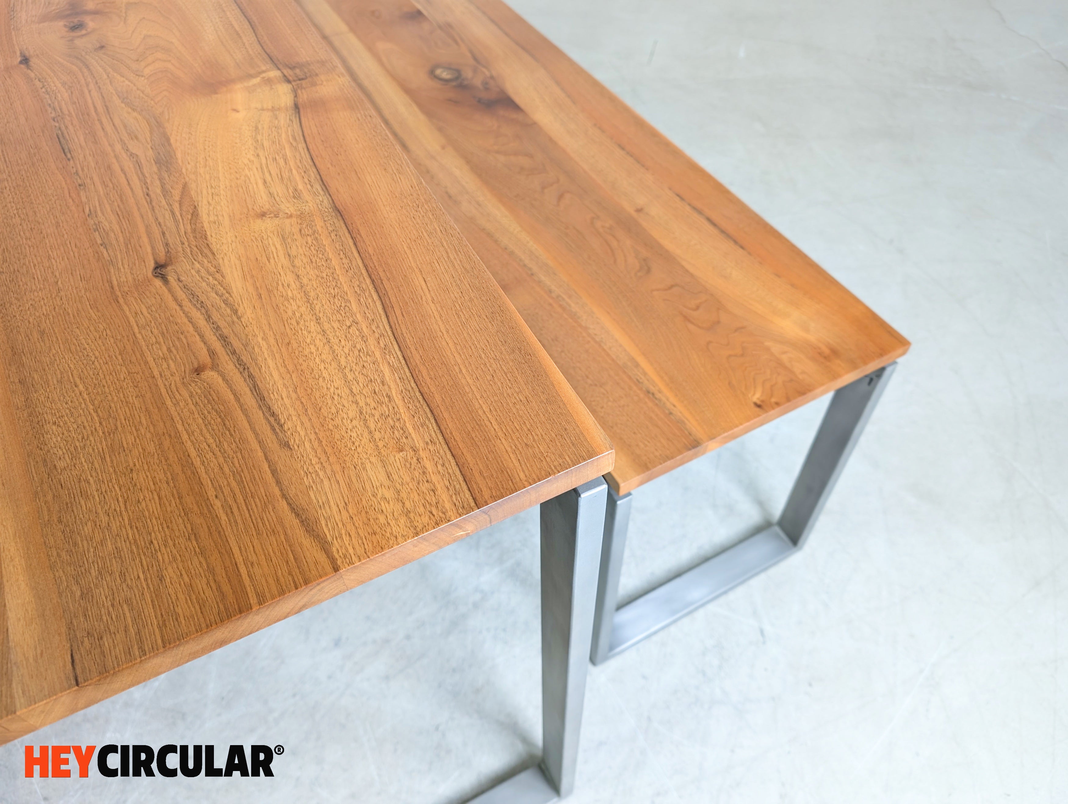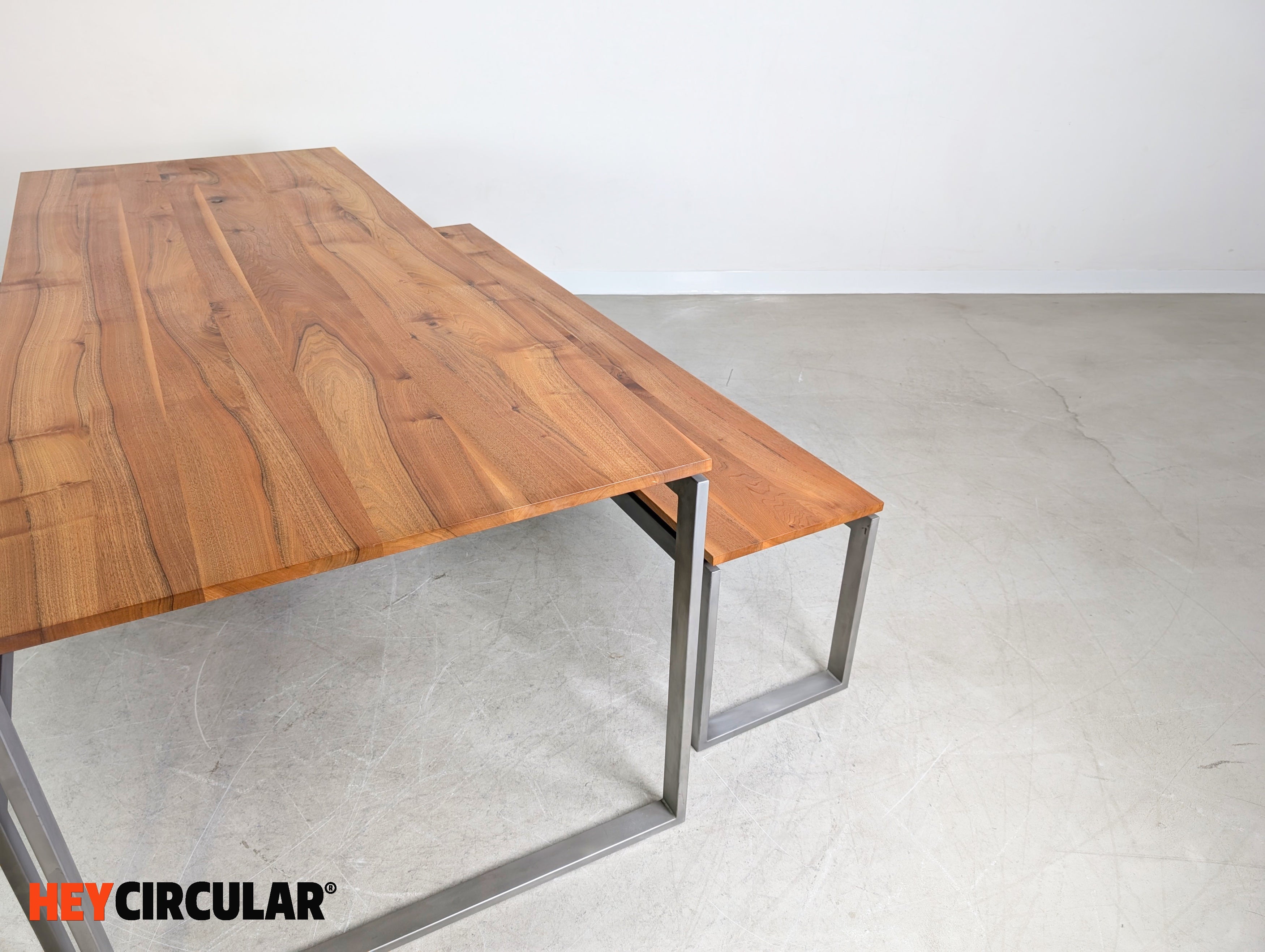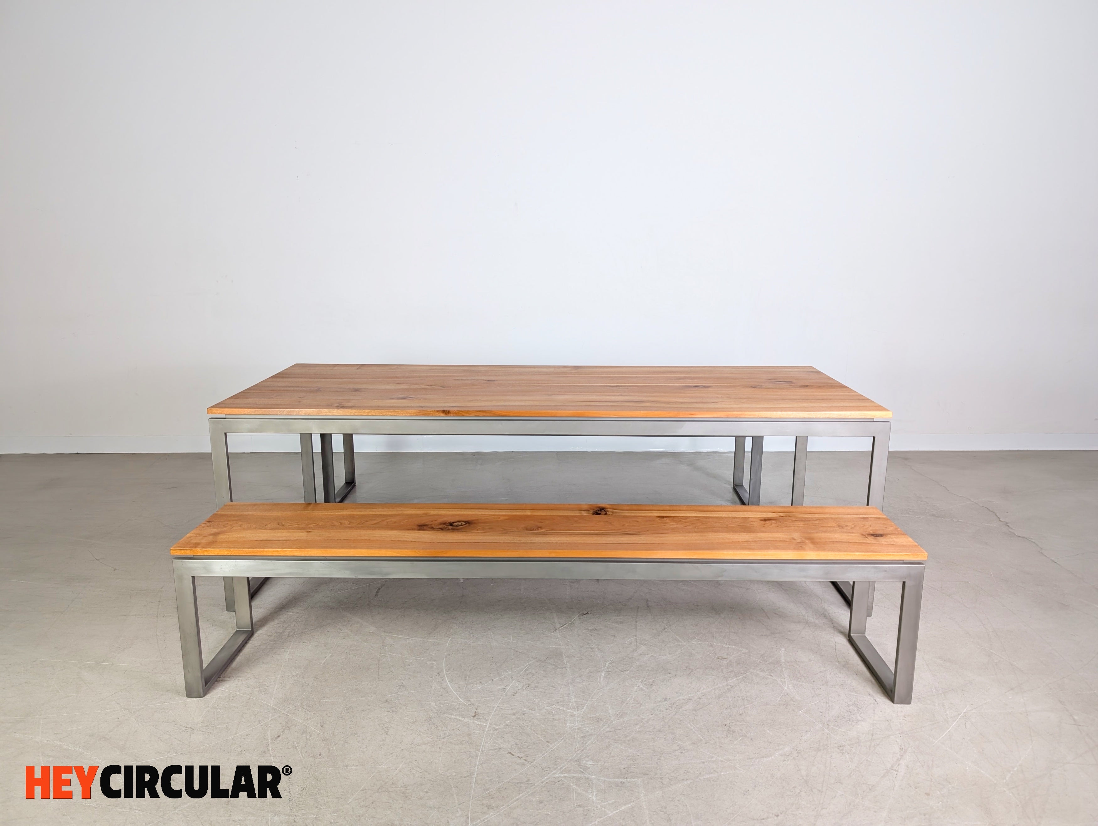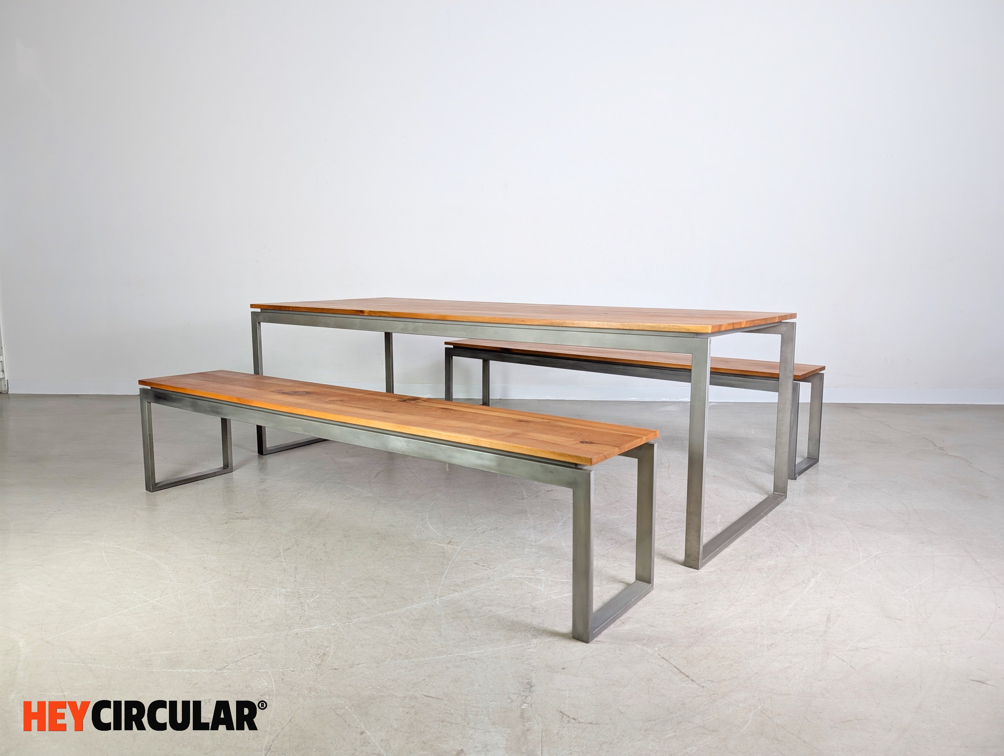 Wir bieten ein wunderschönes Esstisch Set bestehend aus einem Esstisch und zwei Sitzbänken. Die Möbel zeichnen sich durch ihr minimalistisches Design und dank der Stahlkonstruktionen ihre äußerst hohe Stabilität aus.