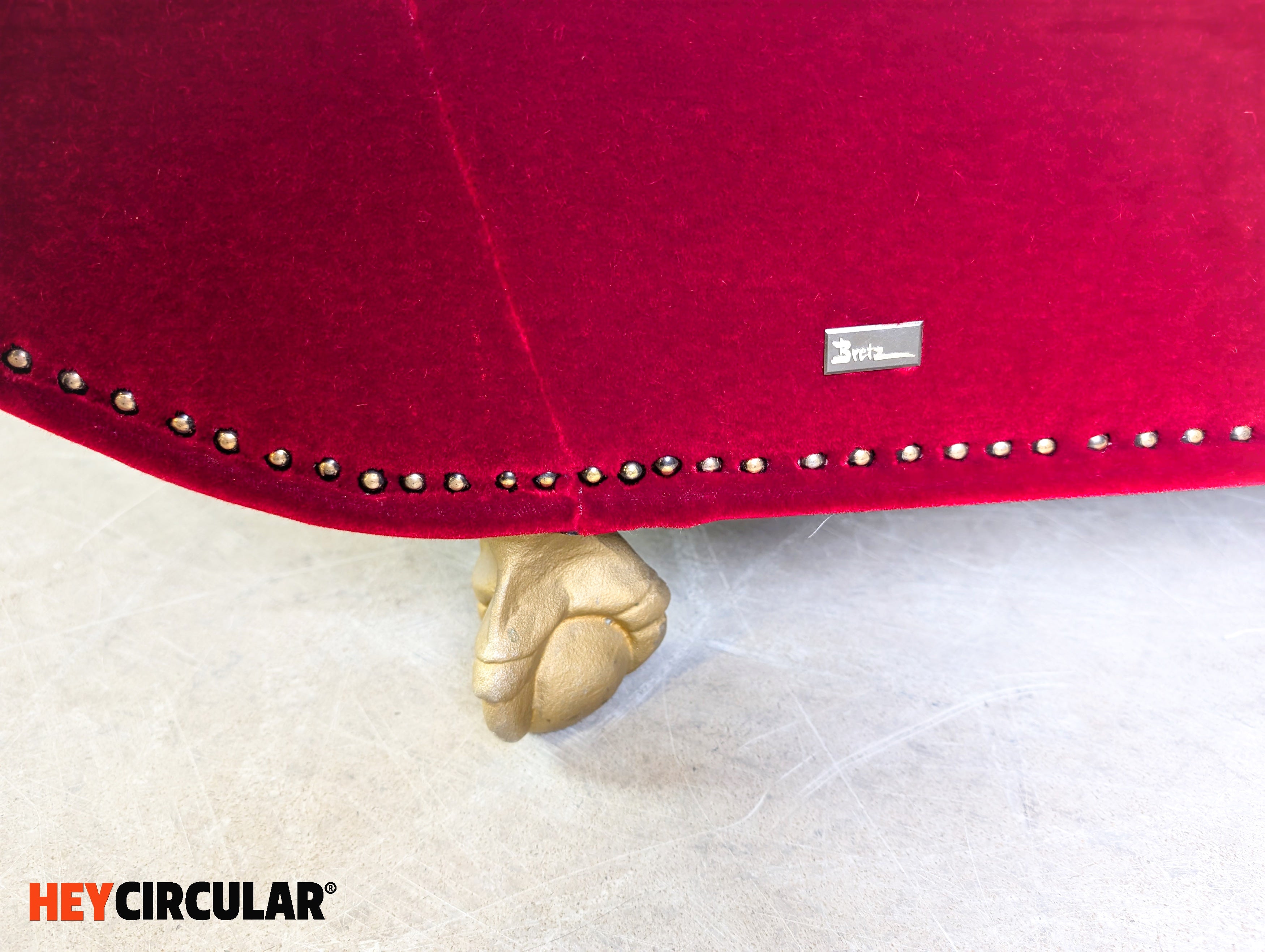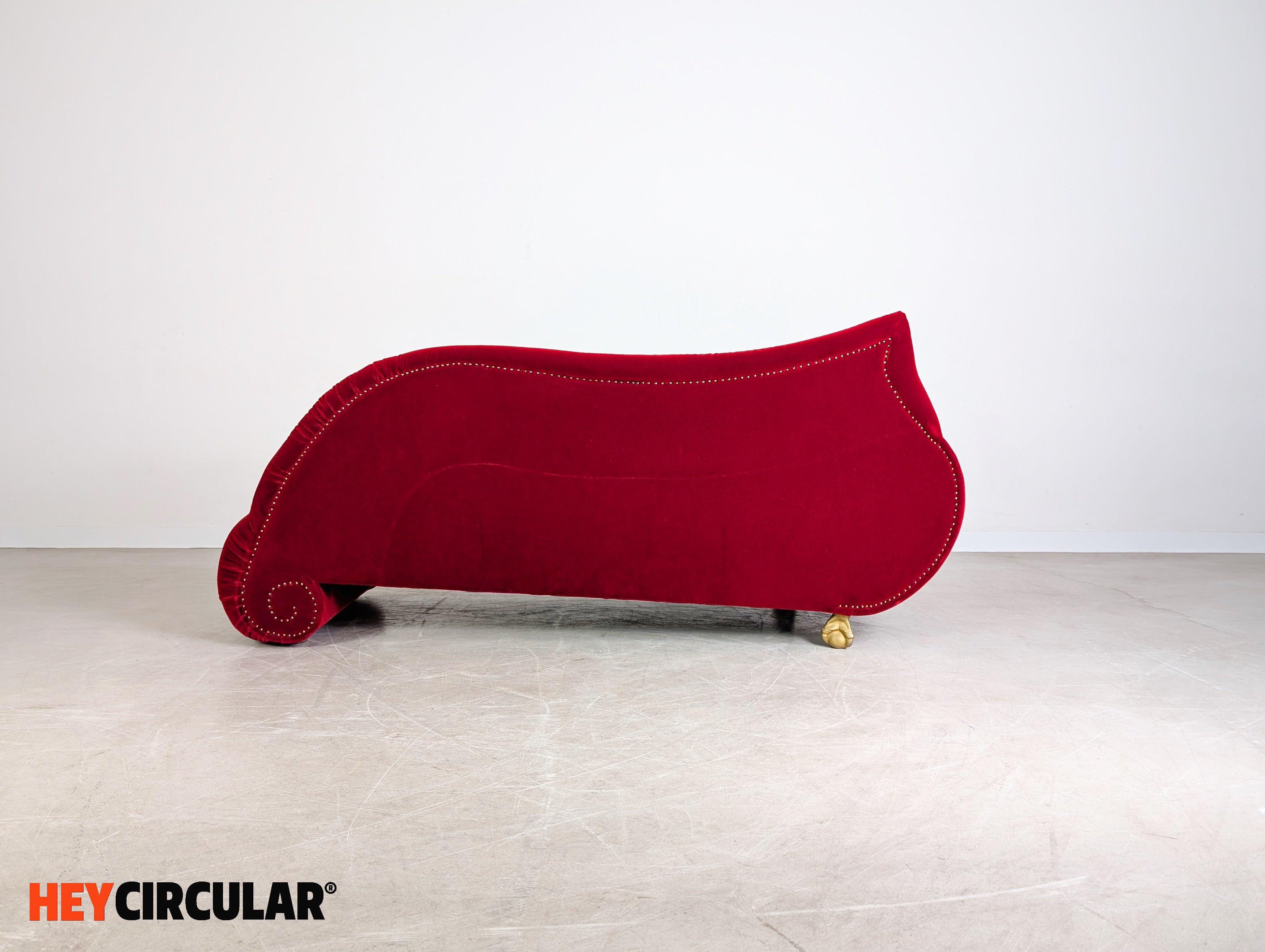 Wir bieten eine wunderschöne Bretz Gaudi Recamiere in rotem Samt Stoff zum Verkauf an. Das Möbel bietet Sitzmöglichkeiten für bis zu drei Personen und ist ein wahrer Blickfang in jedem Raum.